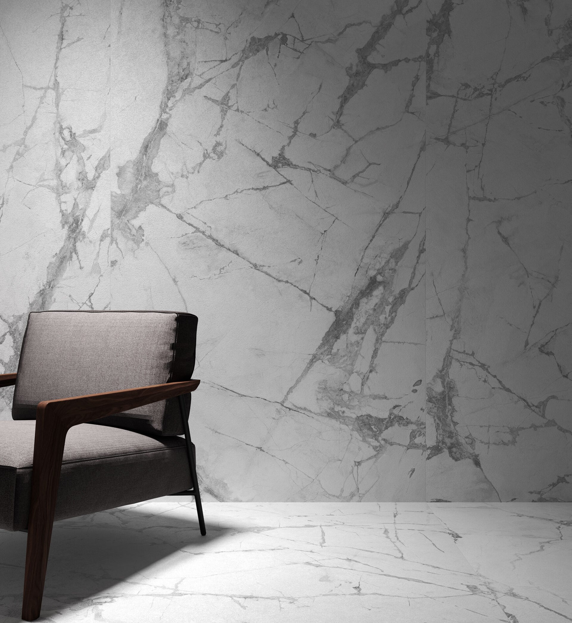 1. Выраженный мрамор в Blanc. Поверхность пестрит прожилками, глубоким блеском и прочими атрибутами натурального мраморного материала. Причем тактильные ощущения подтверждают реализм, поскольку эти «вены» можно прочувствовать, проведя рукой по поверхности. Это создаёт ощущение объёма и добавляет реалистичности изображению. Здесь реалистичность усиливается инновационной технологией 3D Fit, когда текстура совпадает с фактурой (рельефом) плитки.