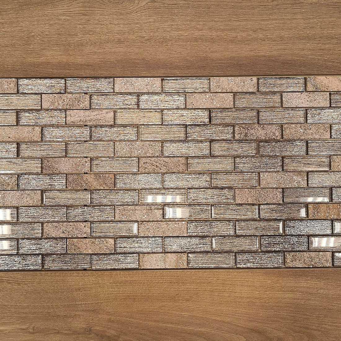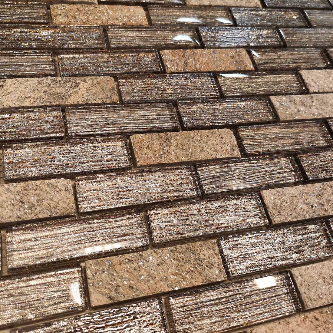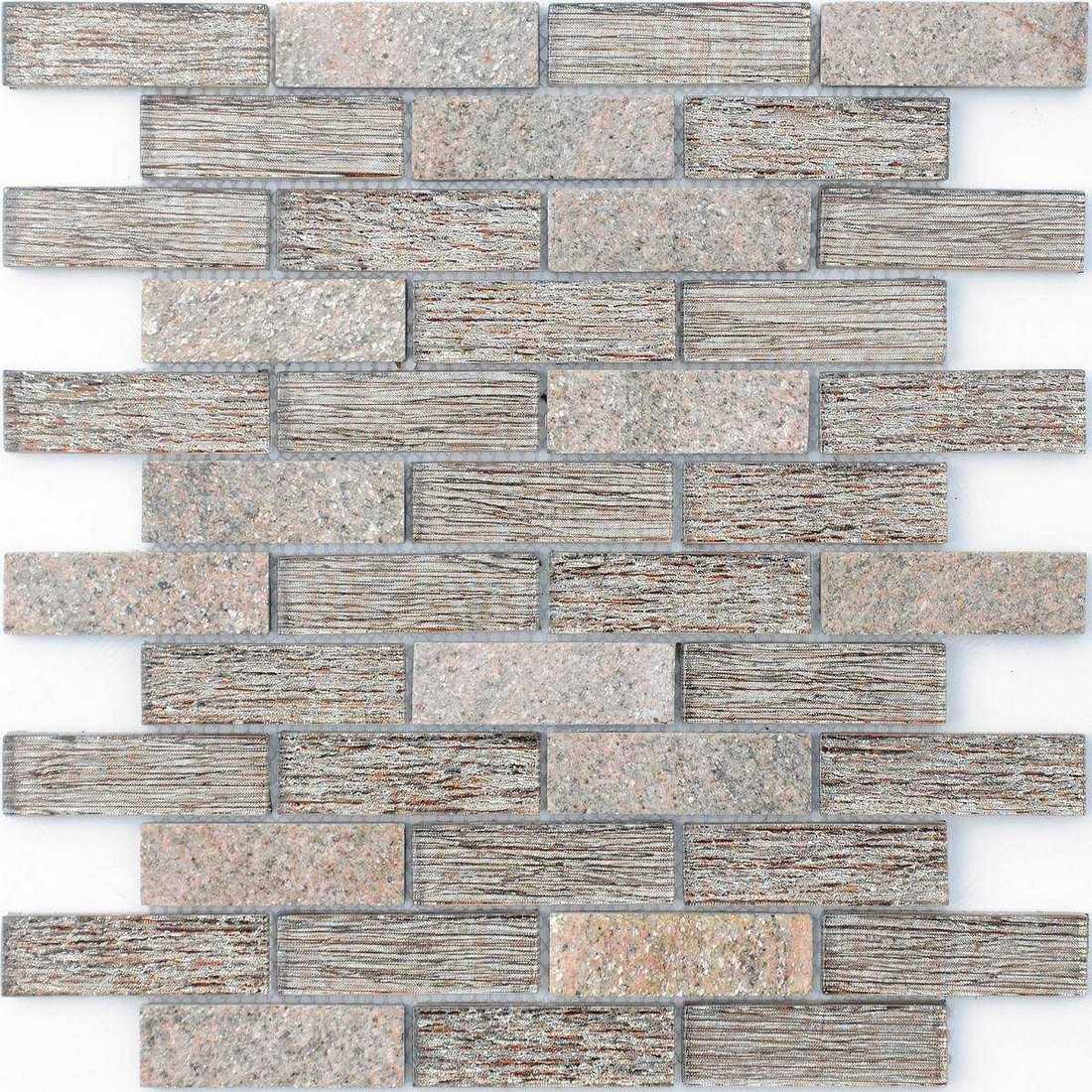 Мозаика произведена в Китае компанией Caramelle & LeeDo. Она имеет серый цвет, который легко сочетается с другими материалами и цветами. Размер плитки — 2,3 х 7,3 см, что позволяет создавать сложные и интересные композиции.