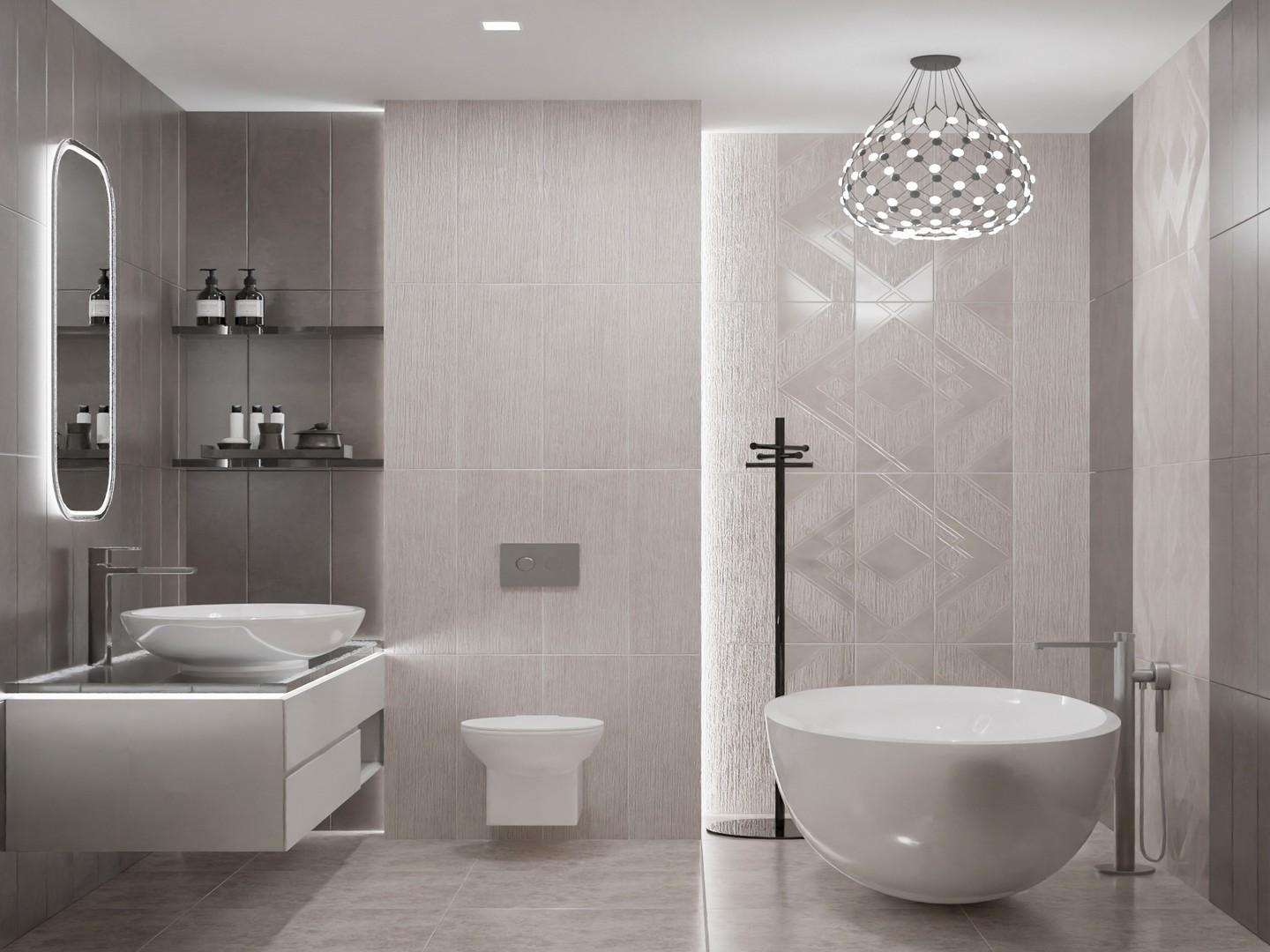 Цвет плитки — серый, что позволяет гармонично сочетать её с различными цветовыми решениями интерьера.