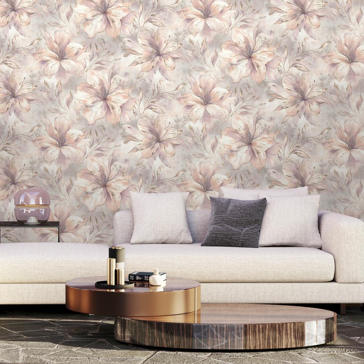Благодаря виниловому покрытию обои можно мыть, что делает их идеальным выбором для любых помещений. Рисунок с цветами в персиковых тонах добавит уюта и свежести в ваш дом.