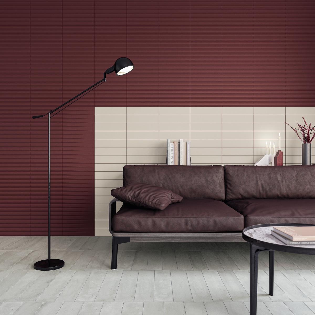 Коллекция Stripes от Wow — это не только практичность, но и стильный акцент в интерьере. Прямоугольная форма плитки и насыщенный бордовый цвет создают современный и выразительный образ.