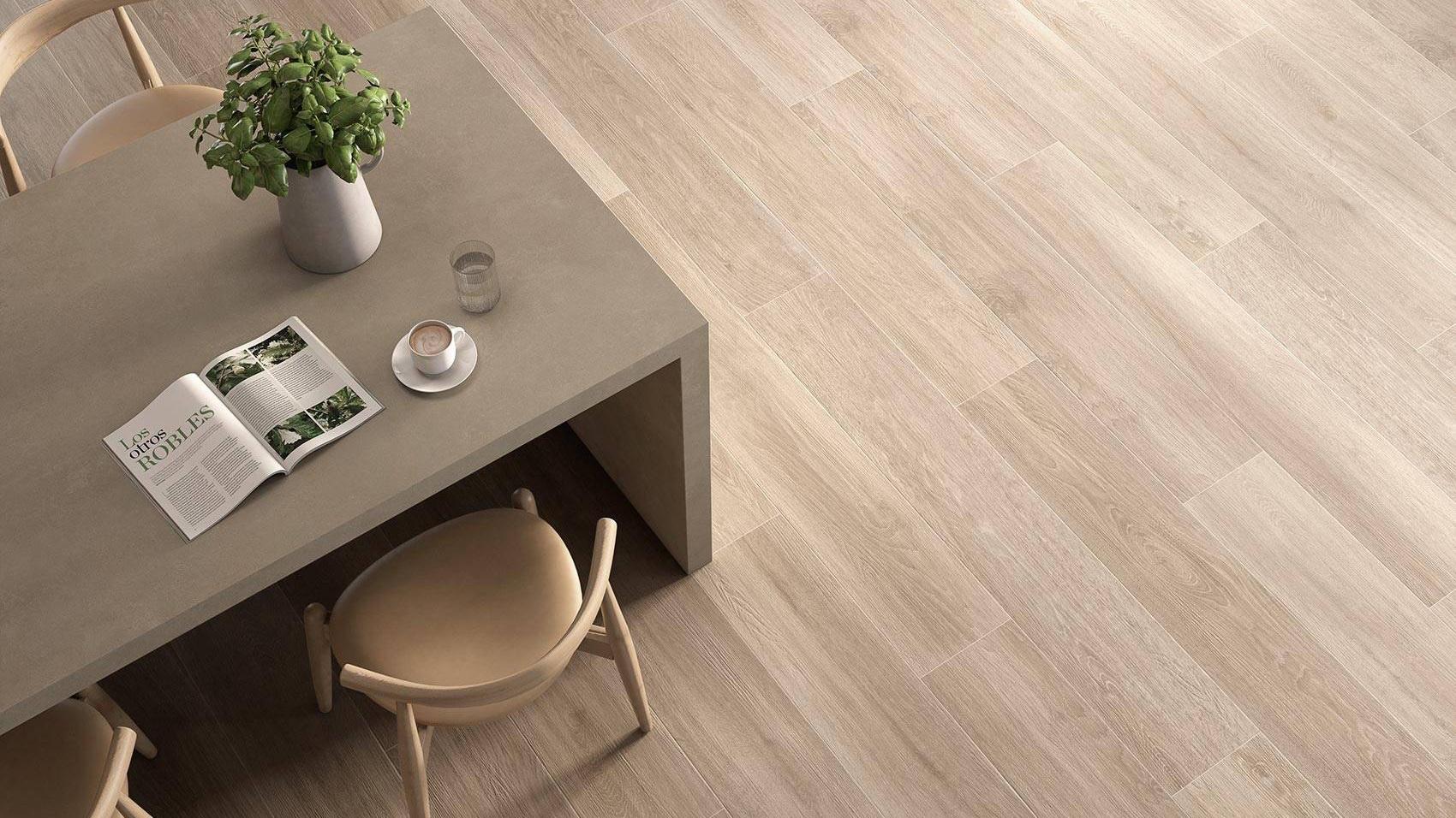 Цвет: бежевый — универсальный цвет, который подойдёт для любого интерьера. Плитка имитирует текстуру дерева, что придаст вашему полу натуральный и уютный вид.
