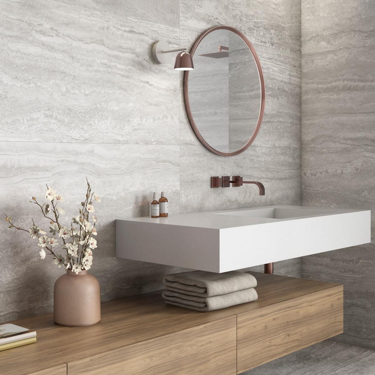Прямоугольная форма плитки позволяет создавать различные дизайнерские решения, а серый цвет гармонично сочетается с разными оттенками и подходит для создания спокойных и уютных интерьеров.