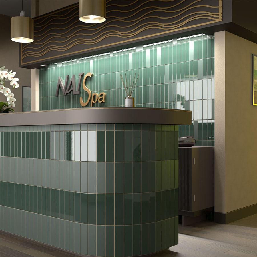 Плитка коллекции Costa Nova от известного испанского производителя Equipe отличается своей глянцевой поверхностью и прямоугольным форматом. Однотонный зелёный цвет плитки придаёт помещению свежий и современный вид.