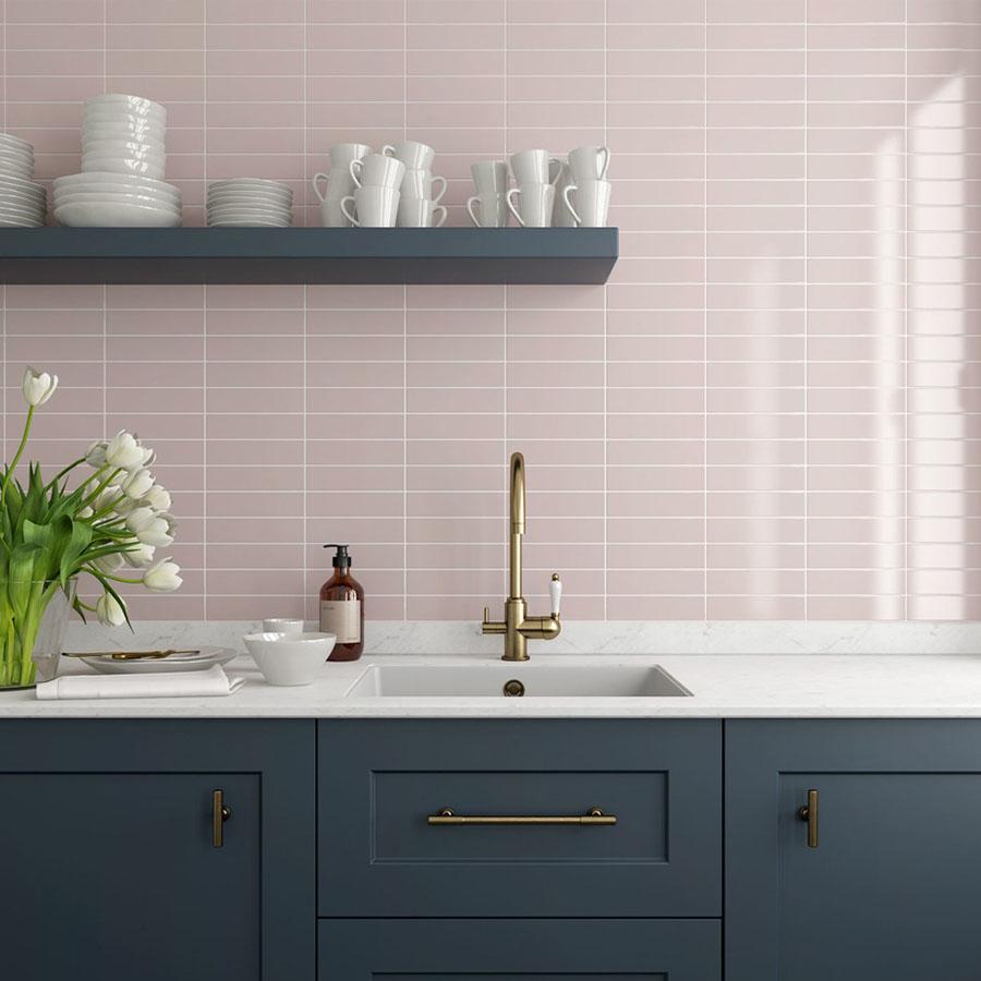Мелкоформатная глянцевая плитка прямоугольной формы выполнена в однотонном розовом цвете, что позволяет легко вписать её в интерьер, оформленный в минималистичном стиле.