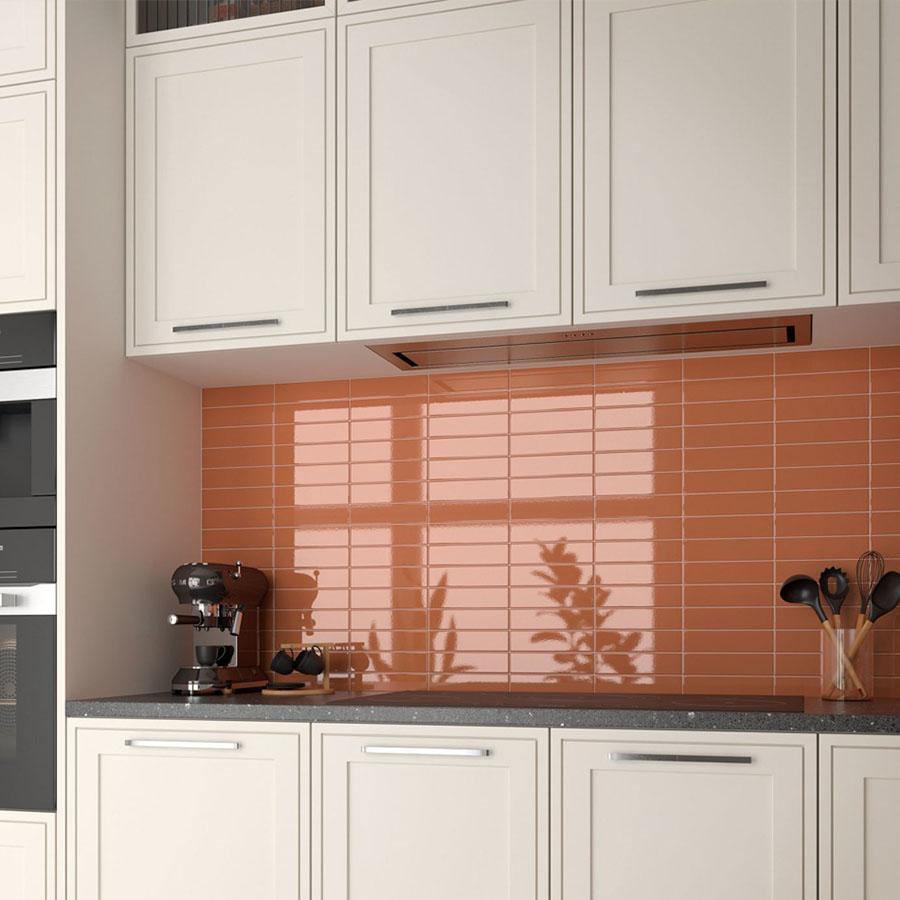 Плитка имеет мелкоформатный размер 5x20 см и прямоугольную форму. Глянцевая поверхность придаёт плитке блеск и создаёт эффектный визуальный акцент в интерьере. Однотонный терракотовый цвет плитки позволяет легко вписать её в минималистичный дизайн.