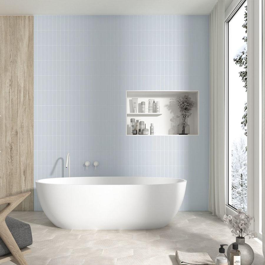 Плитка имеет прямоугольную форму и матовый оттенок, что придаёт ей особый шарм и позволяет легко вписаться в минималистичный дизайн. Голубой цвет плитки добавит свежести и спокойствия в любое помещение.