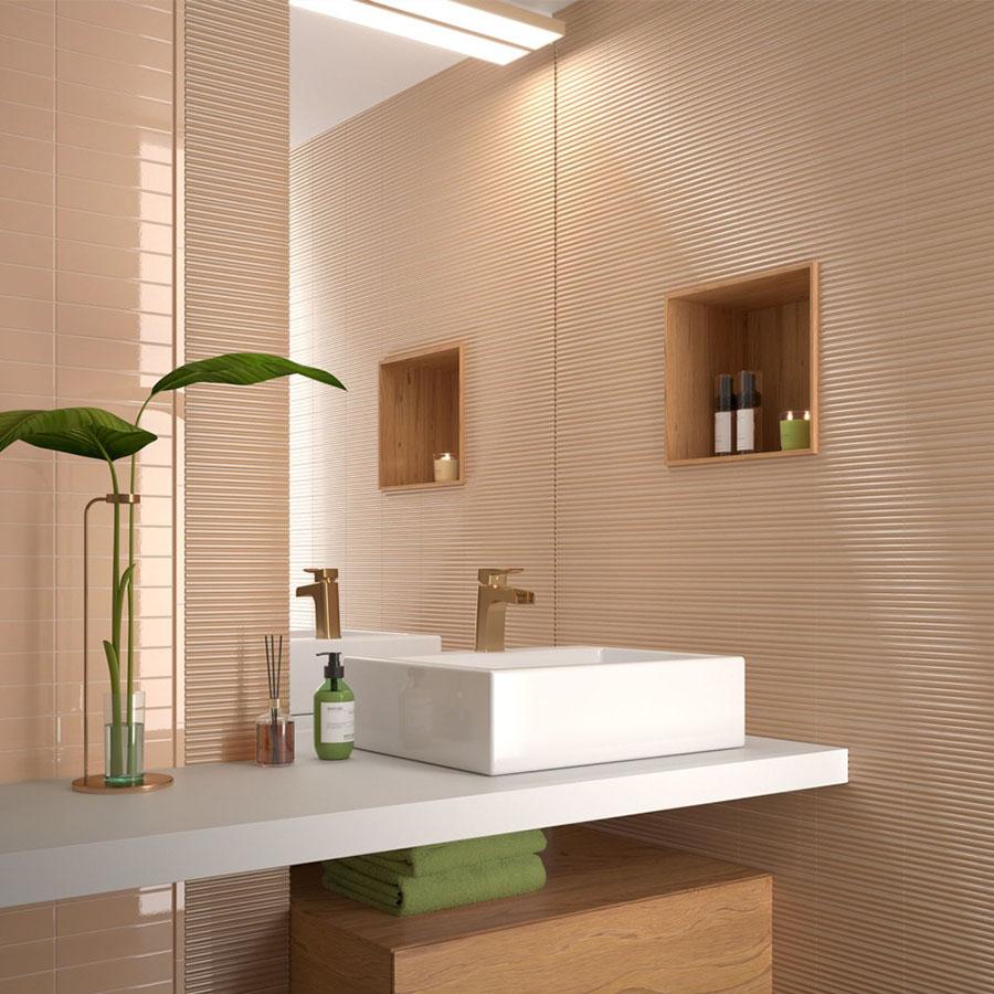 Плитка идеально подходит для отделки стен. Её глянцевая поверхность придаёт помещению изысканный вид. Прямоугольная форма и однотонный бежевый цвет делают плитку универсальной для использования в различных стилях интерьера, включая эклектику.