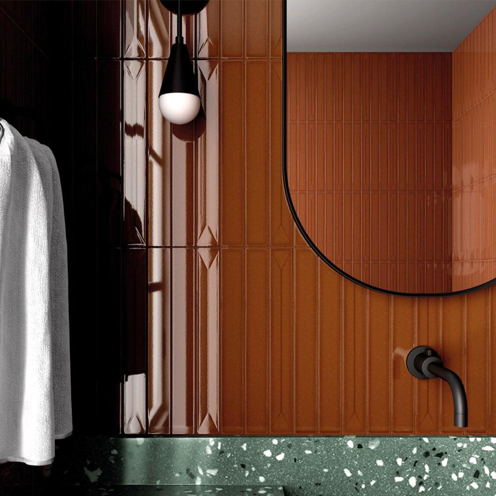 Прямоугольная фигурная плитка с геометрическим узором в бордовом цвете станет прекрасным решением для отделки стен. Она добавит в ваш интерьер нотки стиля ар-деко.