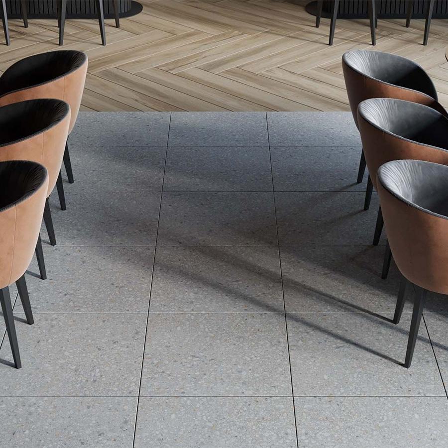 Коллекция Aglomerat отличается стильным дизайном, который подойдёт для различных помещений. Керамогранит в матовом исполнении имеет серый цвет, что позволяет использовать его для создания спокойных и гармоничных интерьеров.