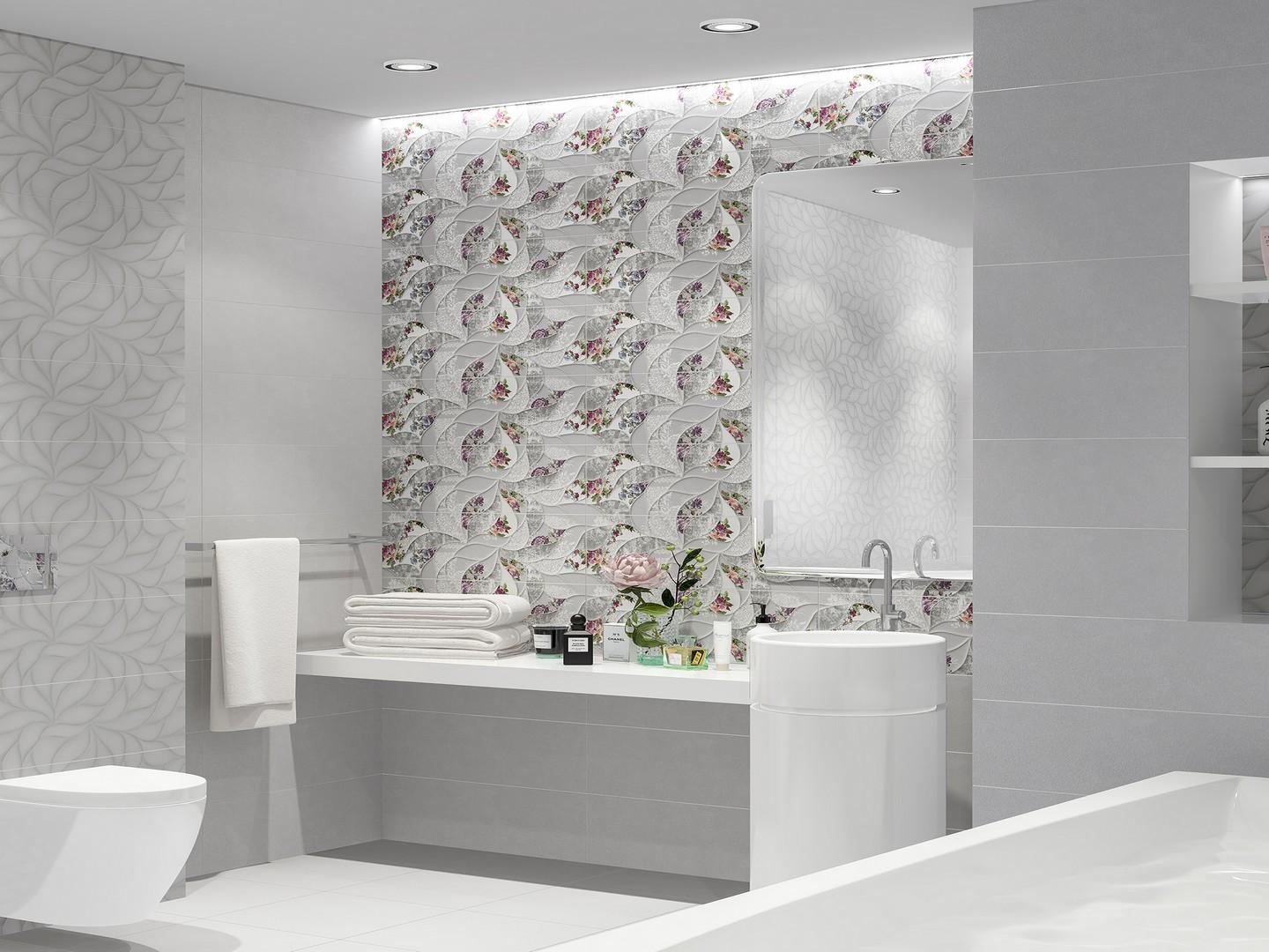 Плитка имеет размер 24,2x70 см и матовую поверхность, что придаёт ей особую элегантность и позволяет гармонично сочетаться с различными стилями оформления. Коллекция Malwiya Floris выполнена в серых тонах с флористическим декором, что создаёт атмосферу уюта и комфорта.