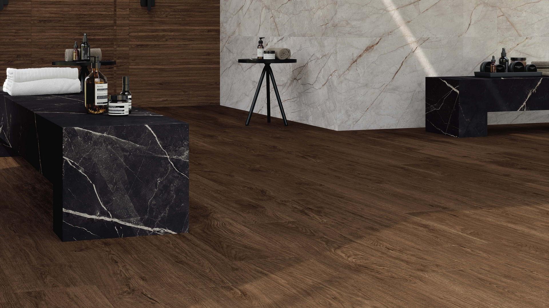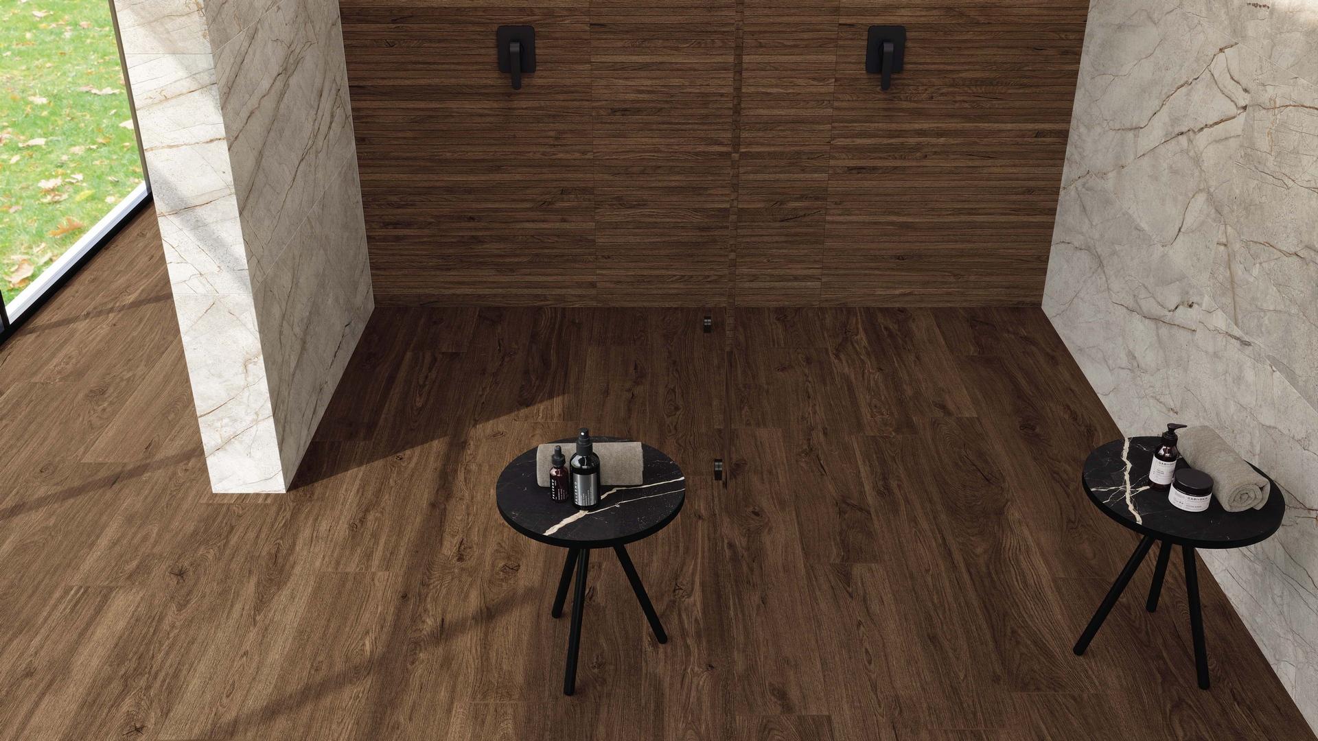 Дизайн: плитка имитирует текстуру дерева, что позволяет создать уютную и тёплую атмосферу в помещении.