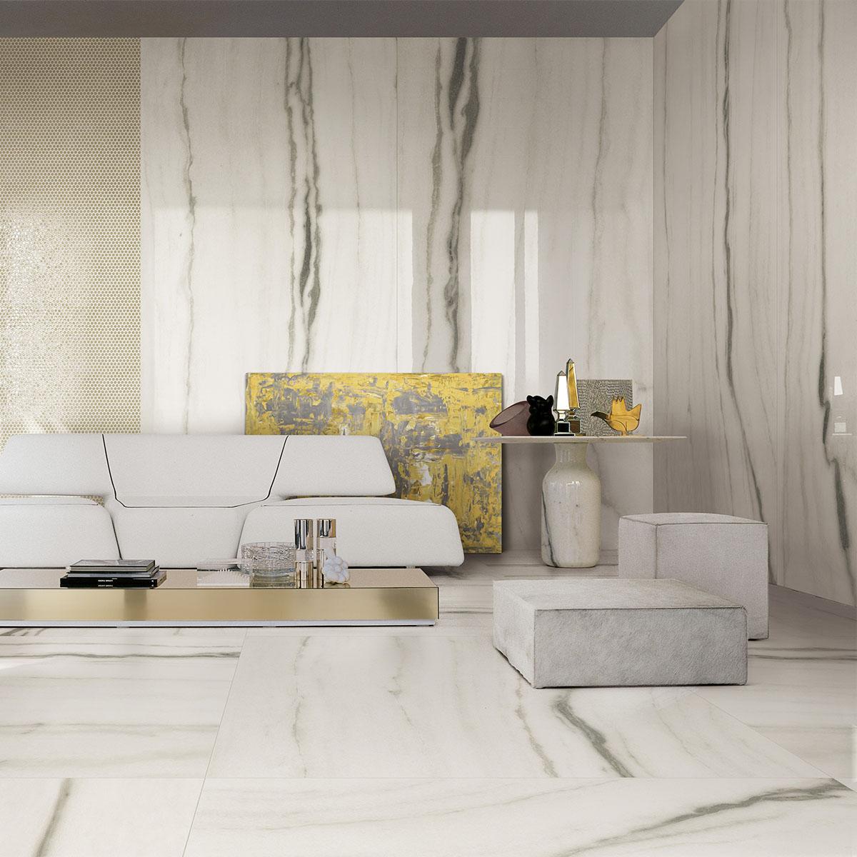 Благодаря своим размерам керамогранит идеально подходит для укладки на пол в различных помещениях — от гостиной до прихожей. Глянцевая поверхность придаёт плитке особый блеск и делает интерьер более выразительным.