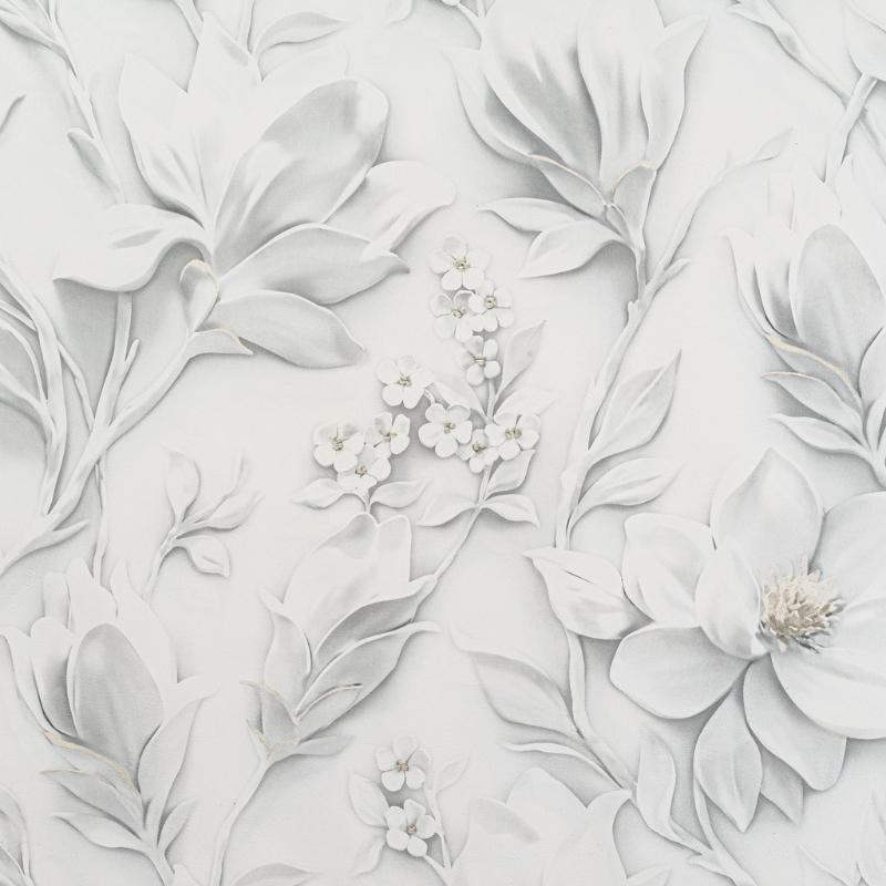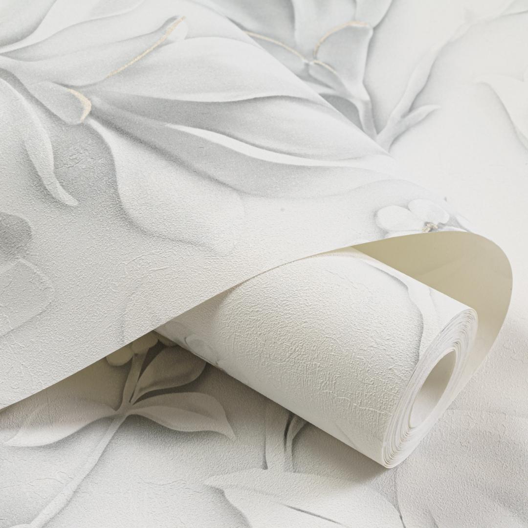 Дизайн обоев флористический, в белом цвете. Они подойдут для любого стиля интерьера и станут прекрасным фоном для мебели и аксессуаров.