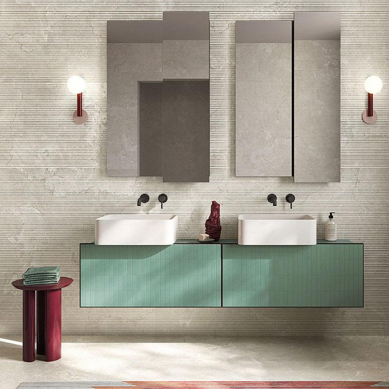 Плитка имеет размер 60x120 см, что позволяет удобно и быстро выполнять укладку. Её ребристая структура придаёт поверхности особый рельеф, делая интерьер более выразительным.