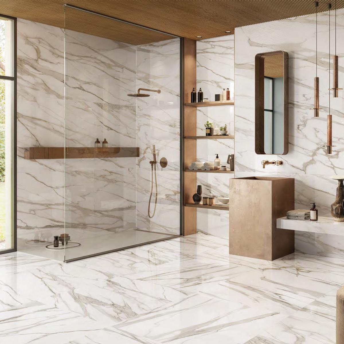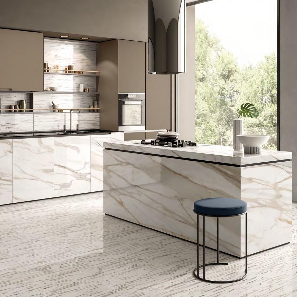 Керамогранит Calacatta Gold Canova Lappato имеет лаппатированную поверхность, которая придаёт плитке изысканный блеск и лёгкую игру света. Под мрамор цвет плитки создаёт атмосферу роскоши и элегантности. Белый оттенок плитки визуально расширяет пространство и добавляет света в помещение.
