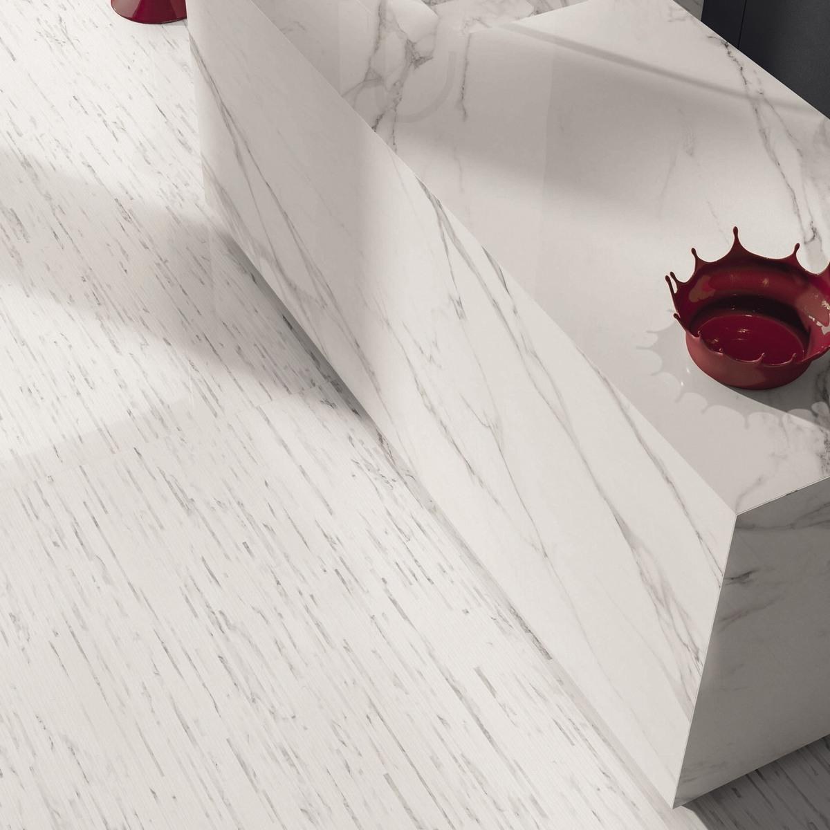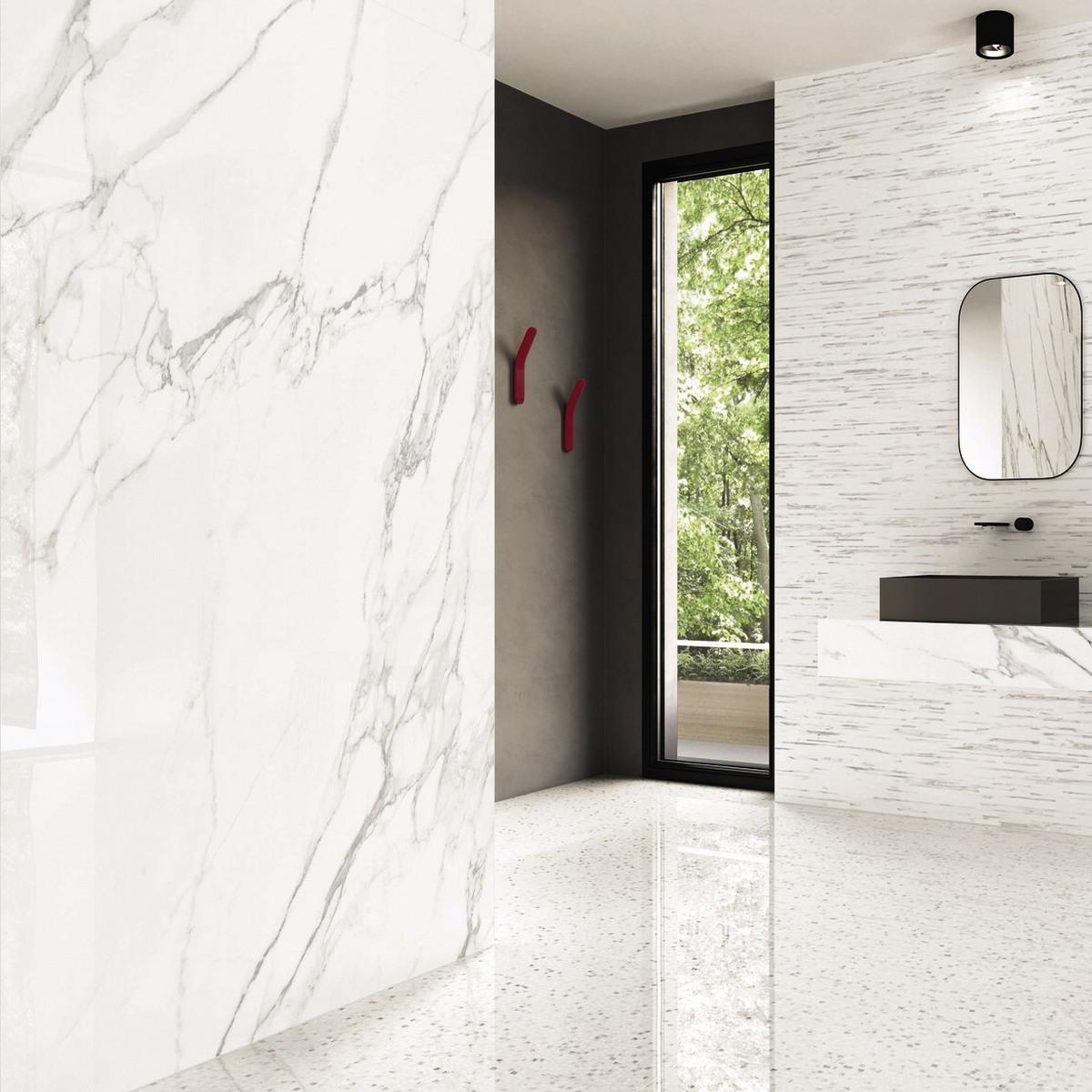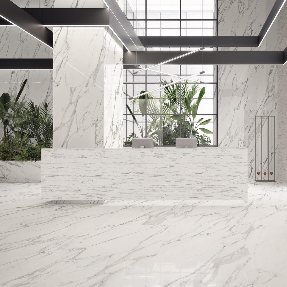 Керамогранит Statuario Michelangelo Lappato имеет лаппатированную поверхность, которая придаёт плитке особый блеск и элегантность. Белый цвет плитки добавит света и свежести в ваш интерьер.