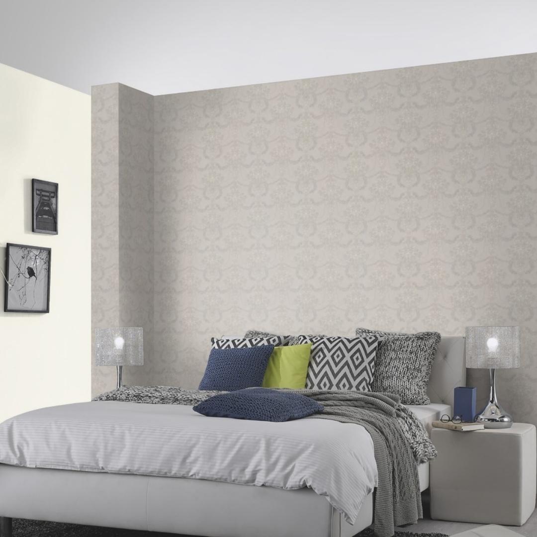 Дизайн: классический. Обои выполнены в серых тонах с изысканным узором в стиле «дамаск».