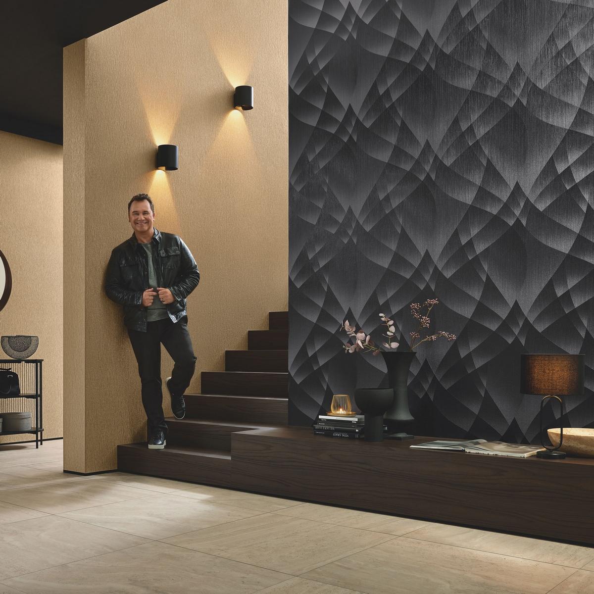 Обои имеют геометрический узор и выполнены в чёрном цвете, что делает их универсальным решением для любого стиля интерьера. Благодаря флизелиновой основе, обои легко клеятся и не деформируются после высыхания.