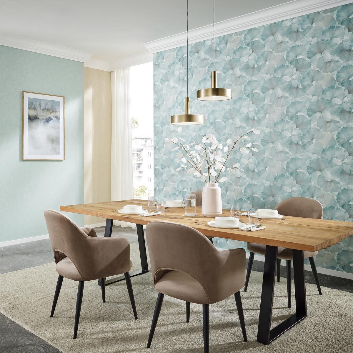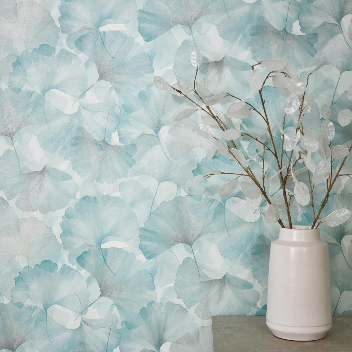 Размер обоев — метровые, что упрощает процесс поклейки и позволяет сэкономить время и силы. Бирюзовый цвет коллекции добавит свежести и оригинальности в ваш интерьер.