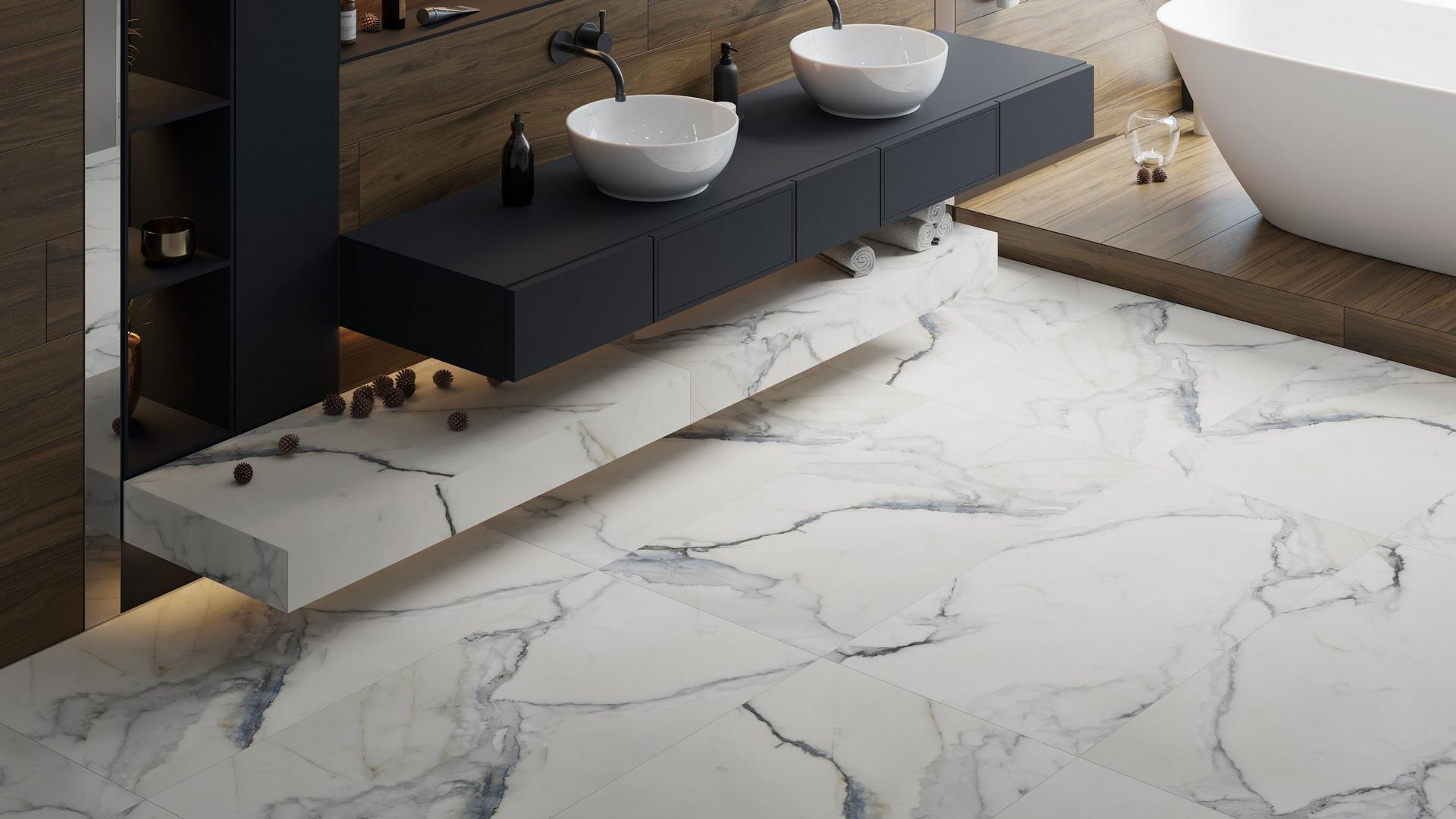 Голубой цвет керамогранита добавит свежести и лёгкости в интерьер, а имитация мрамора придаст ему изысканность и благородство.