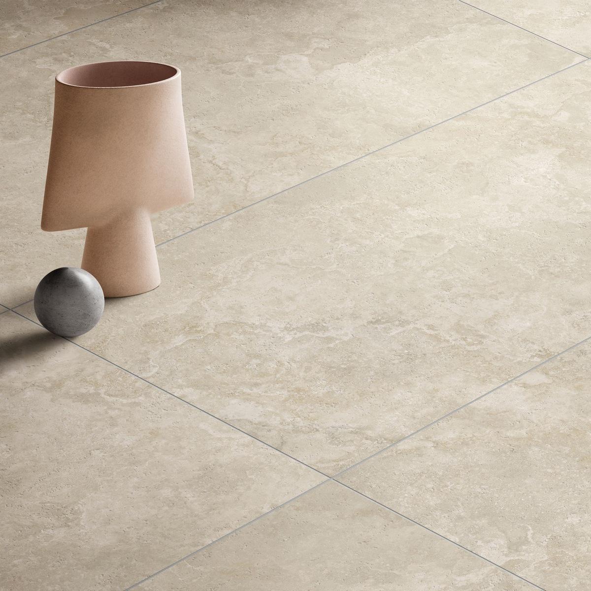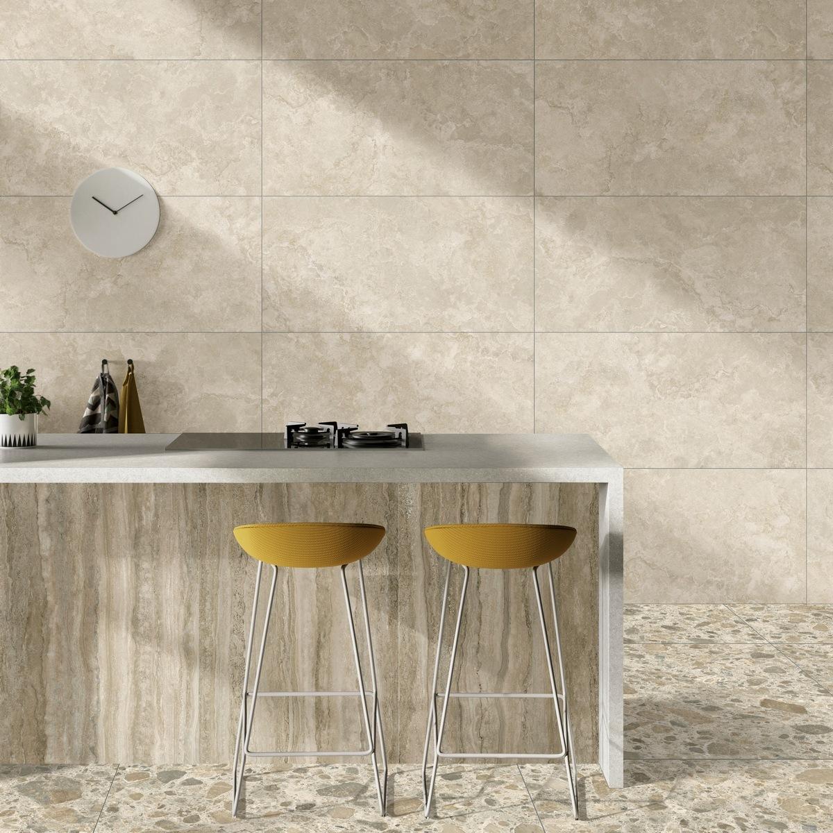 Прямоугольная форма плитки позволяет создавать разнообразные дизайнерские решения. Керамогранит Vitra CityStone Травертин Клауд идеально подходит для отделки пола в гостиной, прихожей, кухне или ванной комнате.