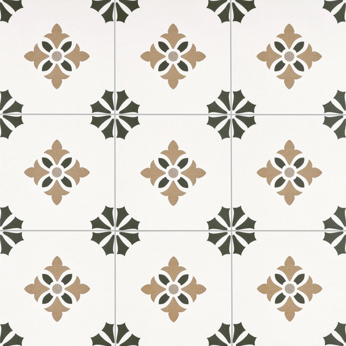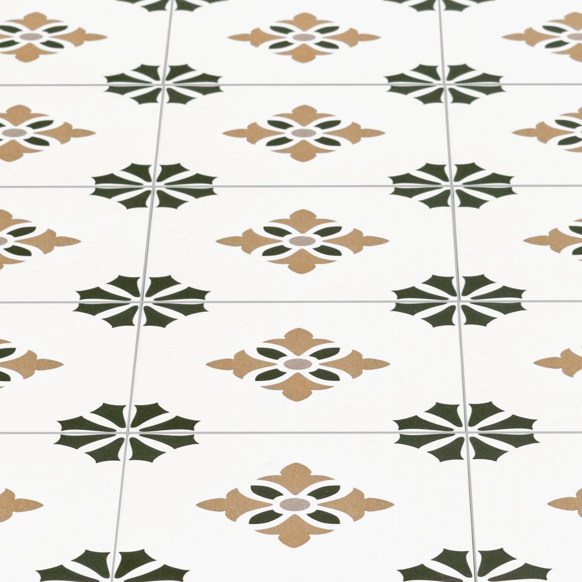 Плитка имеет матовую поверхность, что придаёт ей особый шарм и элегантность. Белый цвет с мавританским орнаментом в оттенке оливы создаёт уникальный и стильный декор.