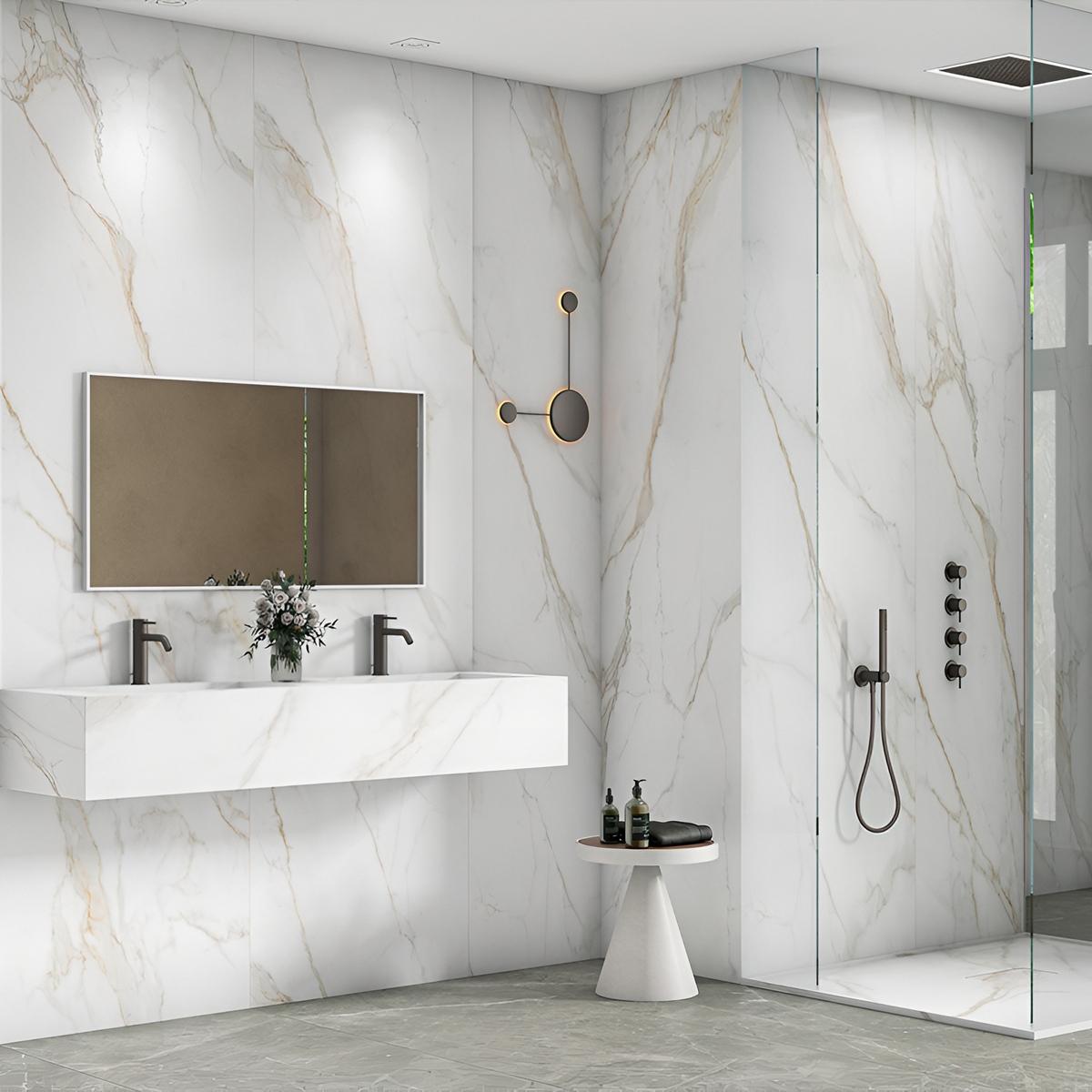 Плитка имеет белый цвет с золотистыми акцентами, что придаёт ей особую элегантность и стиль. Благодаря своим размерам (80x240 мм) керамогранит Motto легко укладывается и позволяет минимизировать количество стыков, что упрощает процесс монтажа и придаёт полу более аккуратный вид.