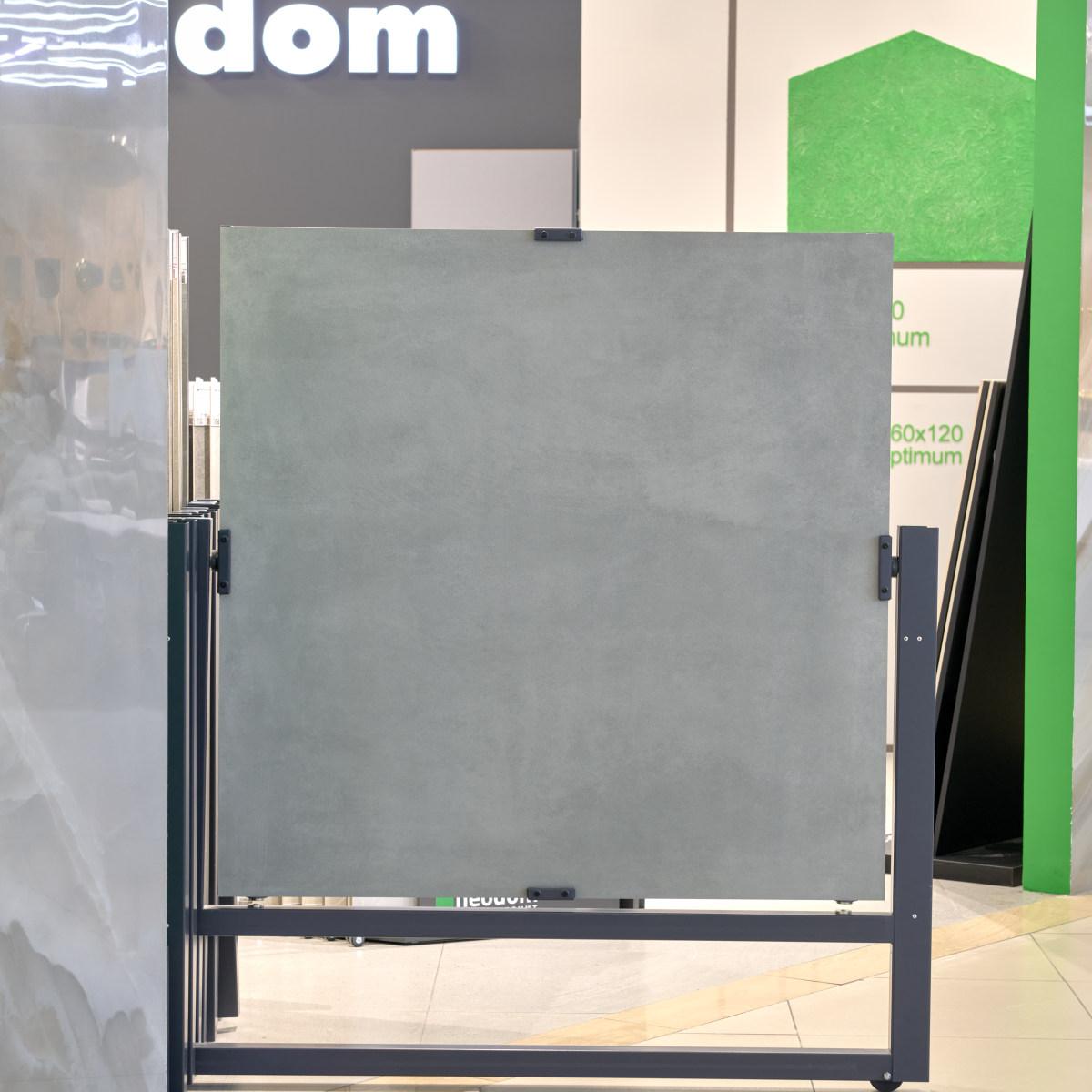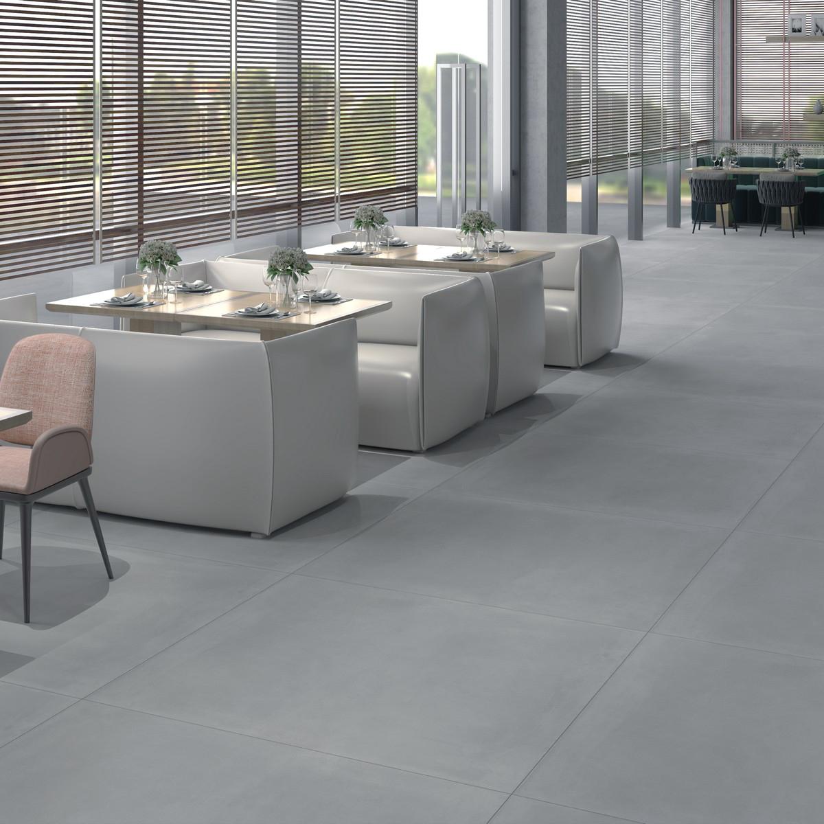 Плитка имеет размер 120x120 см, что обеспечивает удобство укладки и гармоничное сочетание элементов. Матовая поверхность керамогранита под цемент в сером цвете придаёт помещению современный и стильный вид.