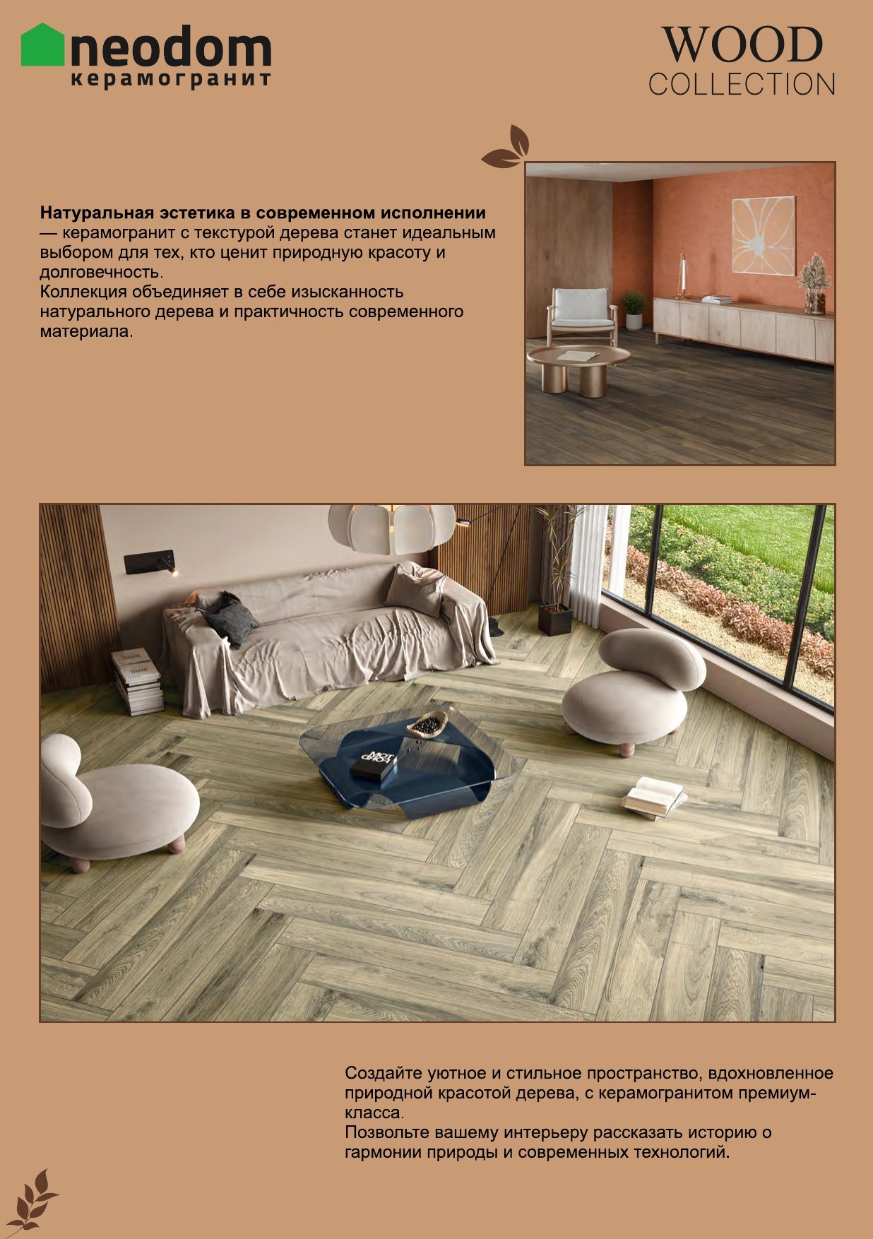 Коллекция Wood collection от производителя Neodom вдохновлена природой и выполнена в тёплых тонах. Керамогранит под дерево с коричневым оттенком Taiga Cocoa Matt добавит уюта и тепла в ваш интерьер. Матовая поверхность плитки придаёт ей особый шарм и скрывает мелкие царапины и следы от ног.