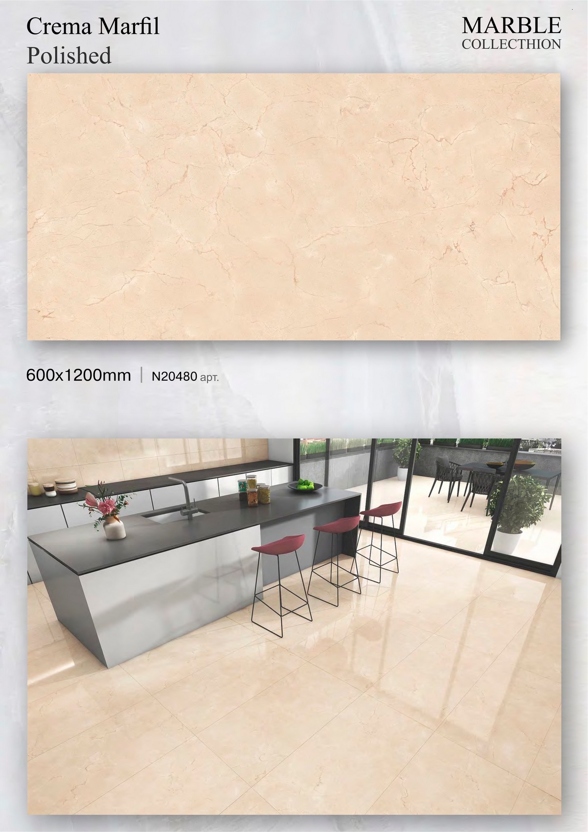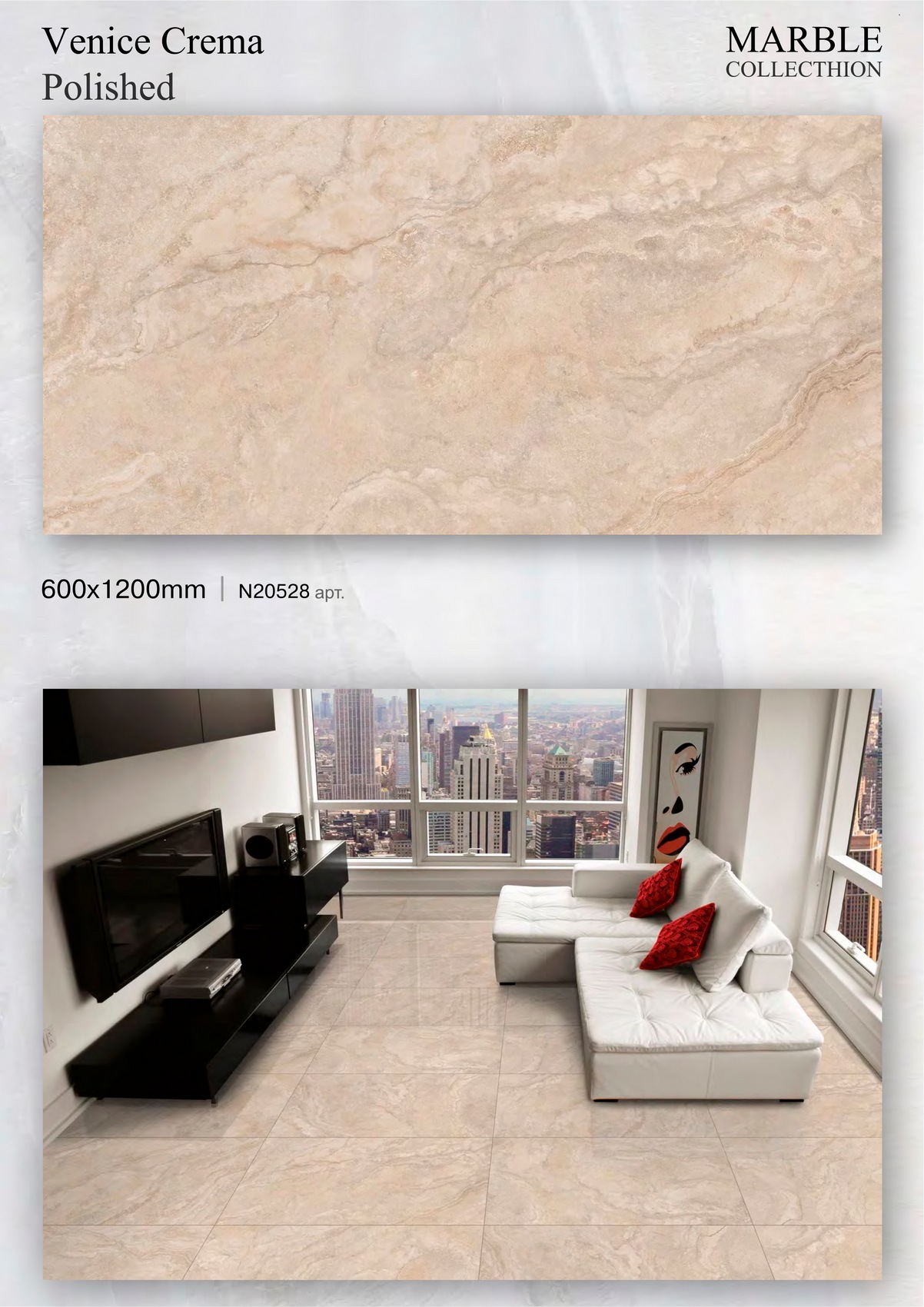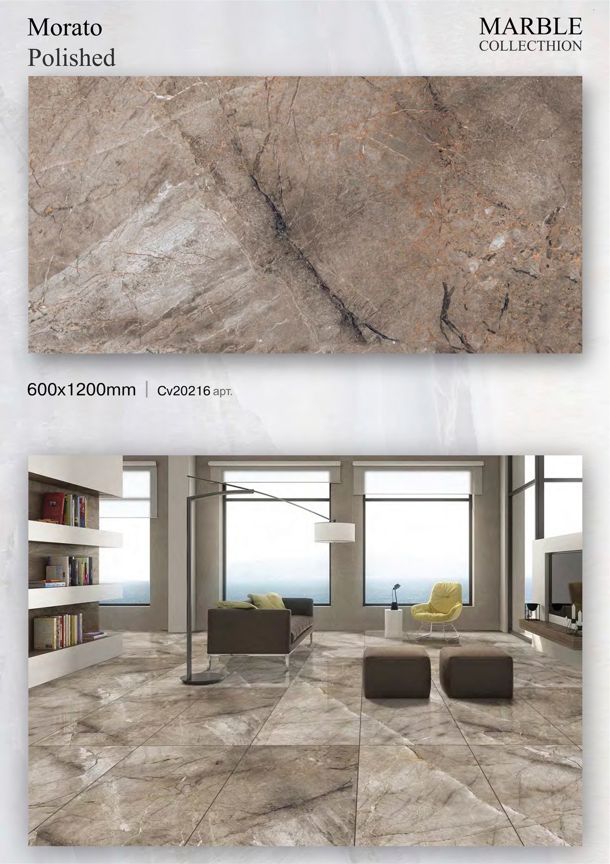 Благодаря своим размерам (60x120 см) плитка идеально подходит для укладки на пол в различных помещениях — от гостиной и спальни до прихожей и кухни. Полированная поверхность керамогранита придаёт ему изысканный блеск и делает его похожим на мрамор.