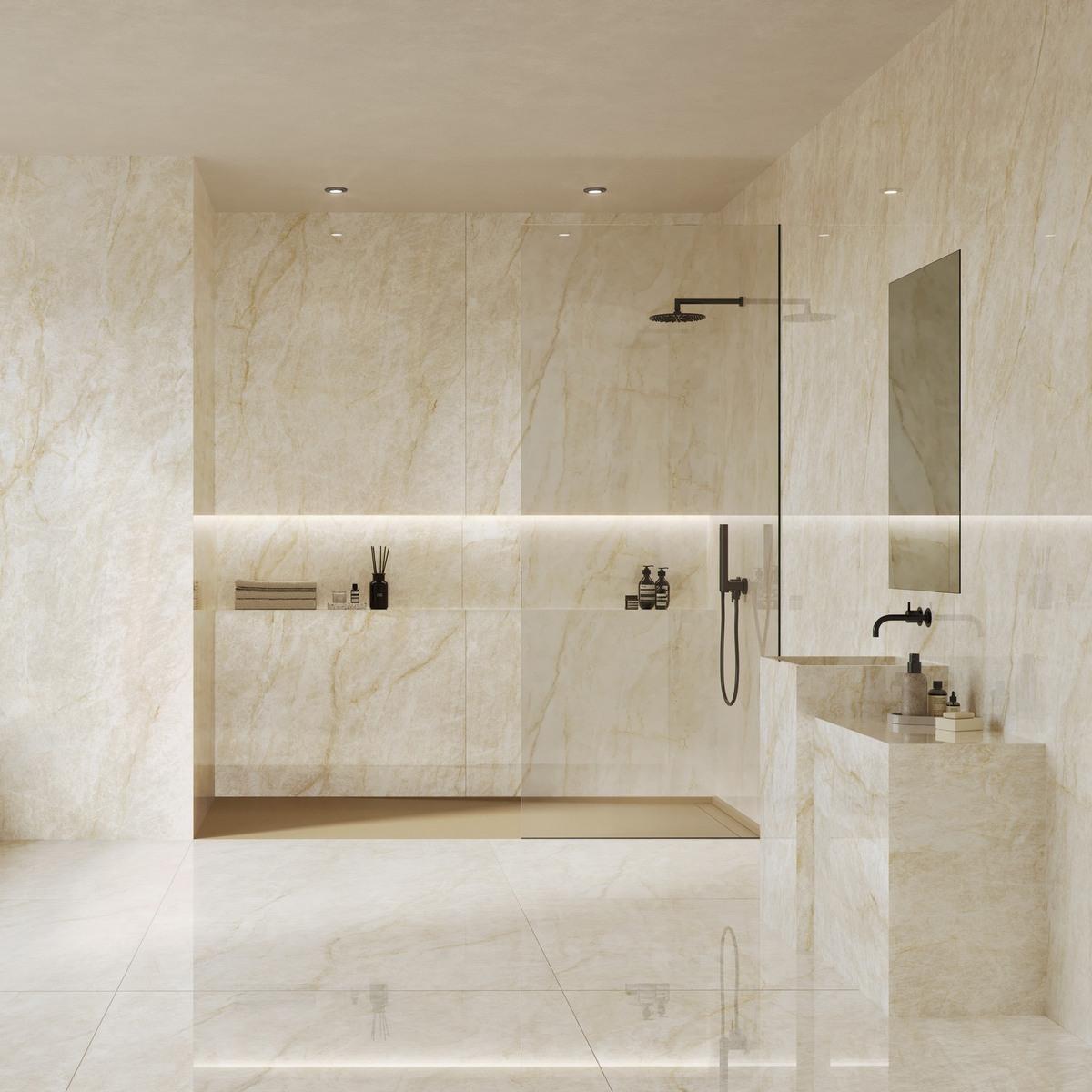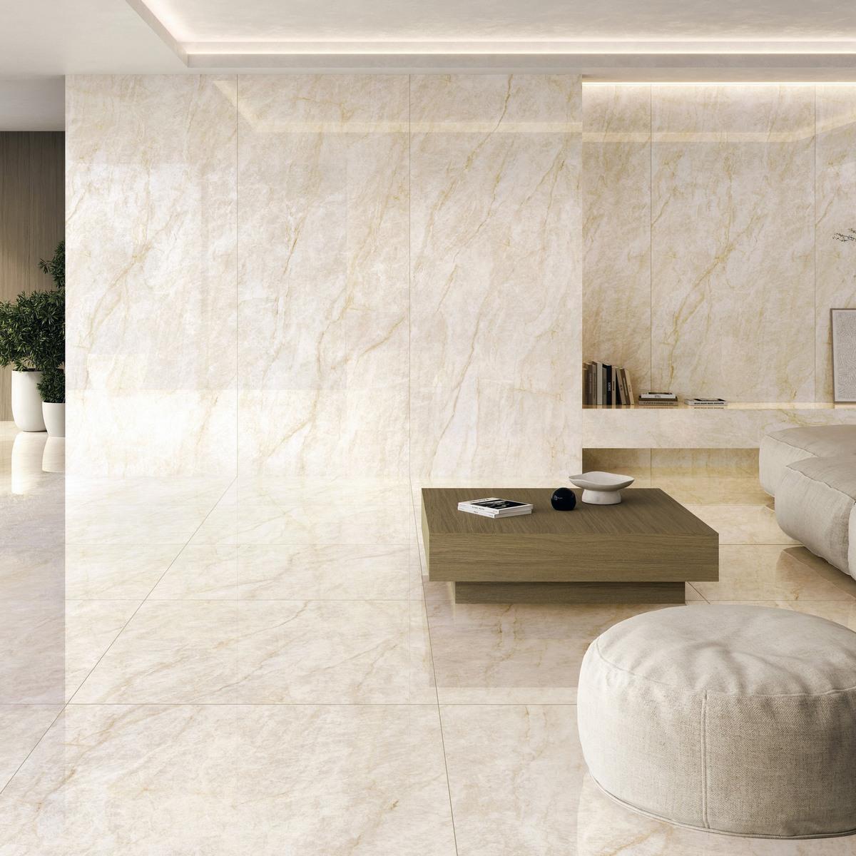 Толщина плитки составляет 6 мм, а размер — 120x280 мм, что обеспечивает удобство монтажа и долговечность покрытия. Полированная поверхность керамогранита придаёт ему зеркальный блеск и подчёркивает его природную красоту.