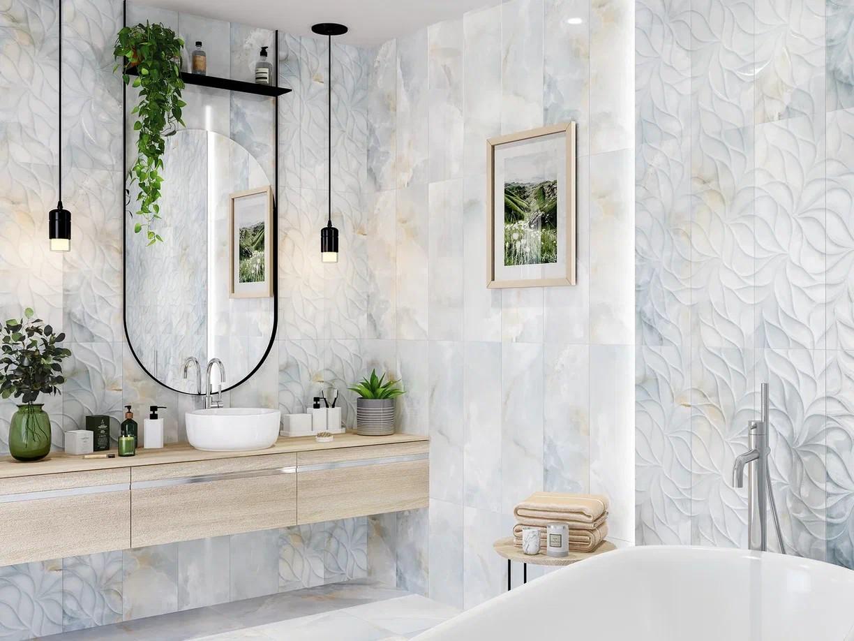 Керамическая плитка Eletto Ceramica Insignia Onix Cielo Brillo 24.2x70 — это глянцевая плитка под мрамор, которая идеально подойдёт для отделки стен в классическом интерьере.