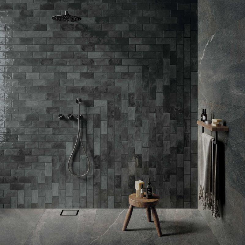 Плитка имеет прямоугольную форму и глянцевый блеск, придающий поверхности изысканный вид. Однотонный чёрный цвет делает её универсальной для различных интерьерных решений.