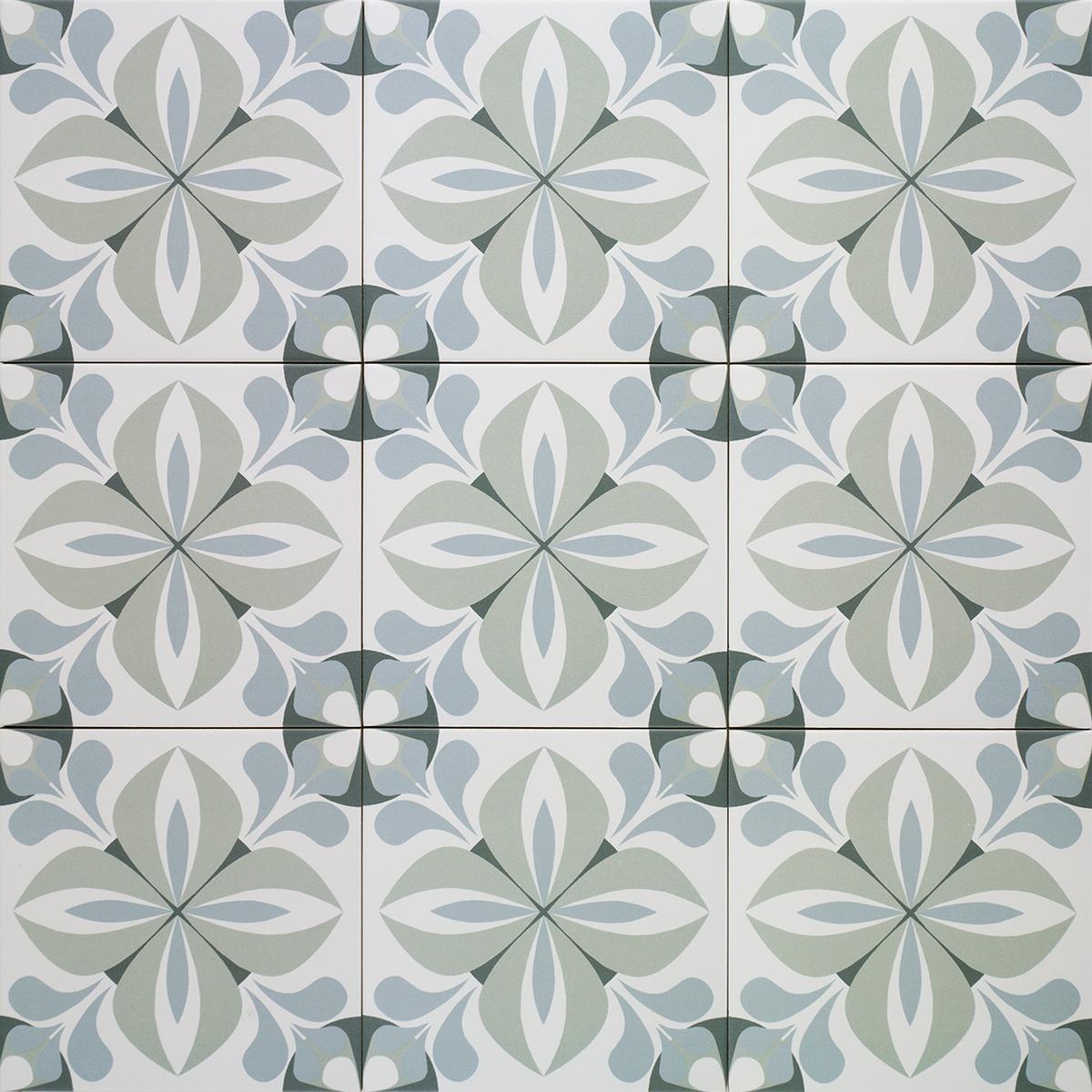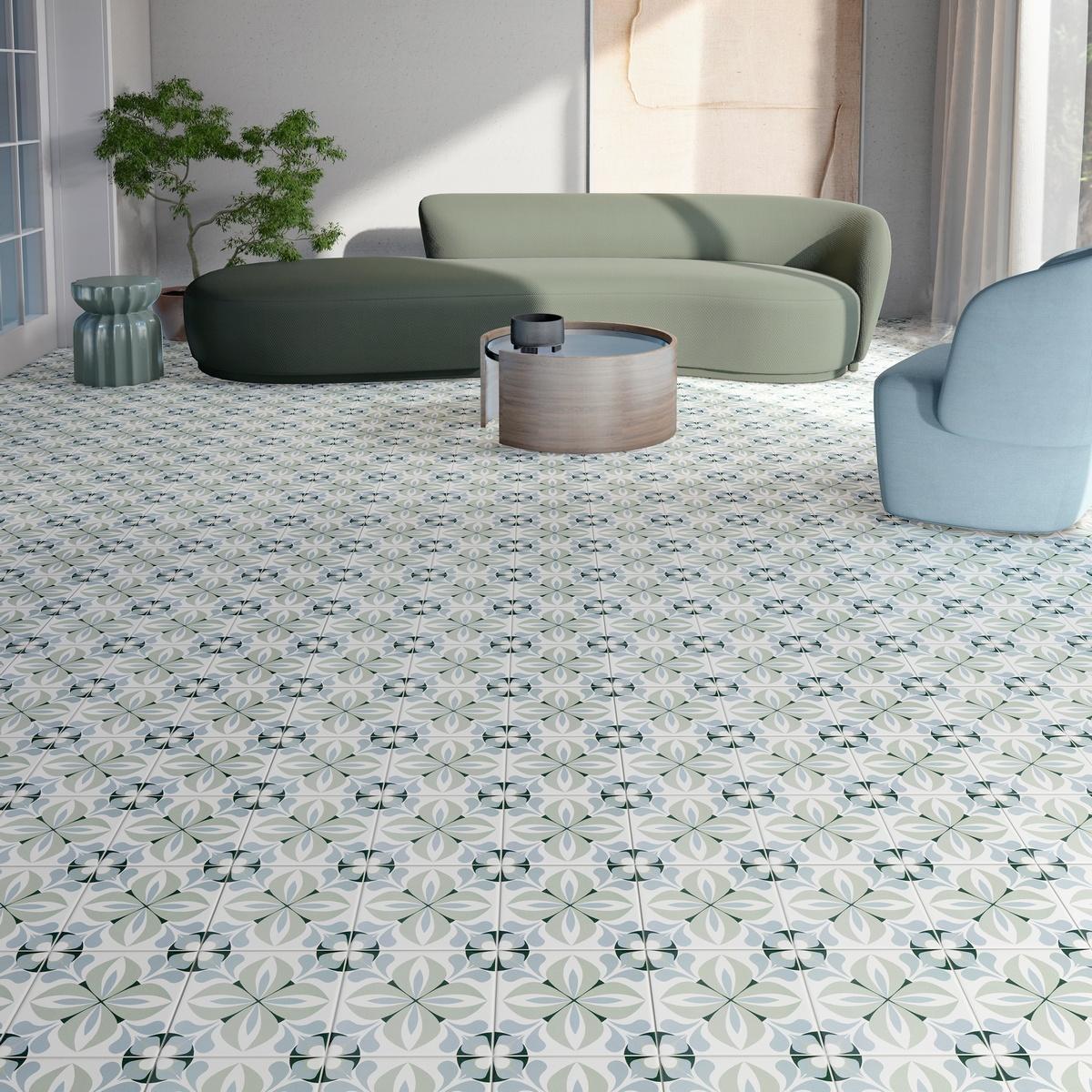 Керамогранит Mainzu Normandy Caen 20x20 — это квадратная матовая плитка, которая станет отличным решением для отделки пола. Она выполнена в современном стиле с геометрическим узором и имеет зелёный оттенок.
