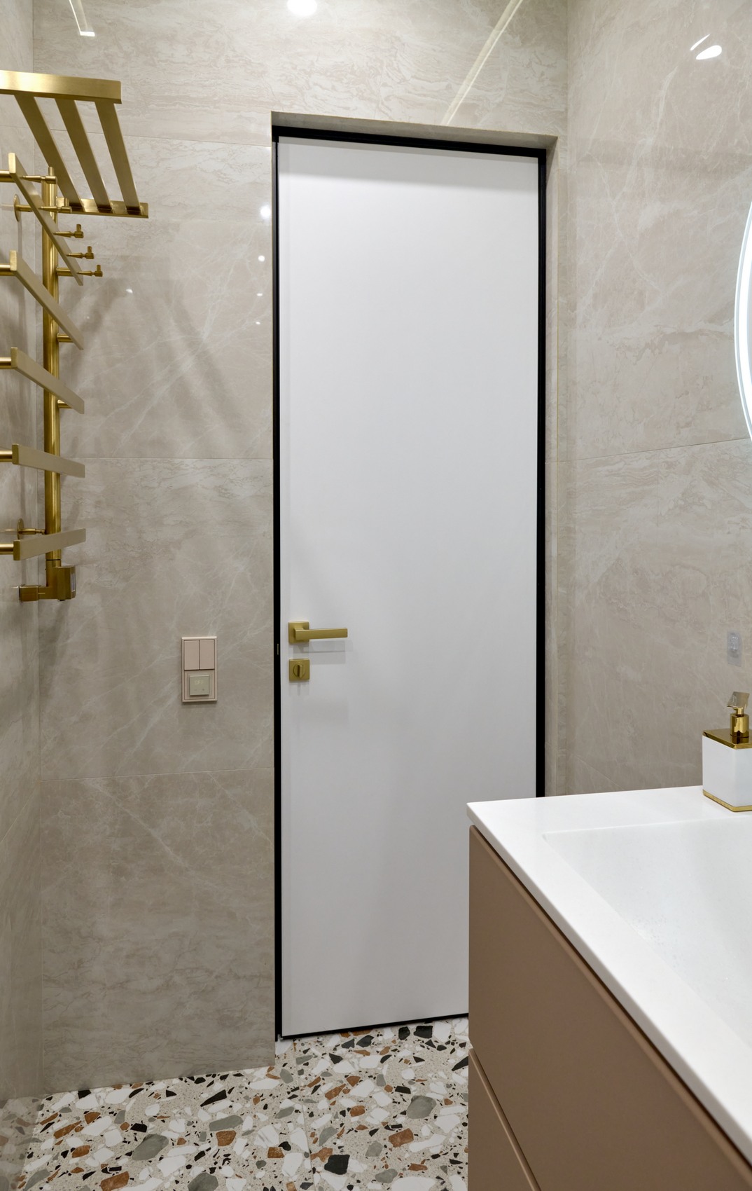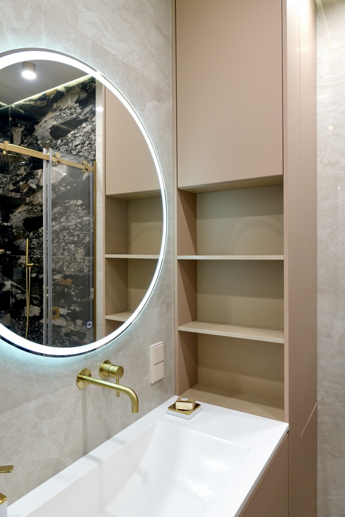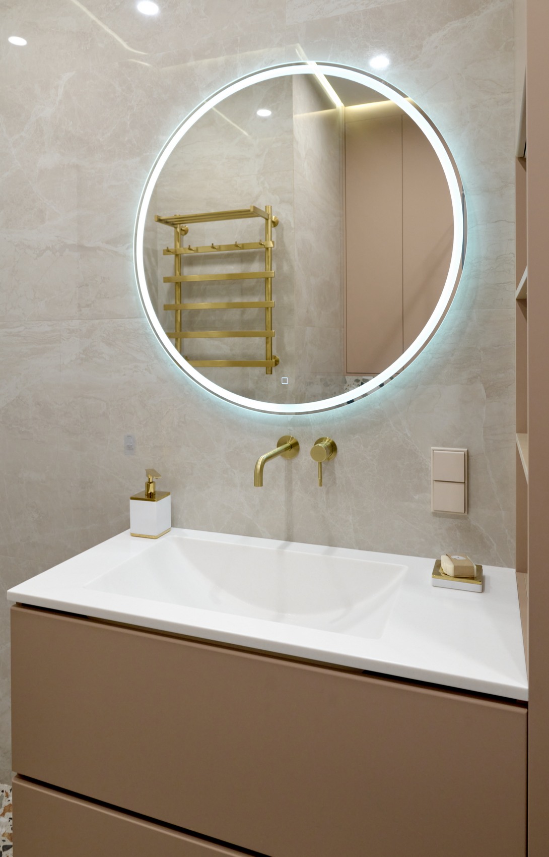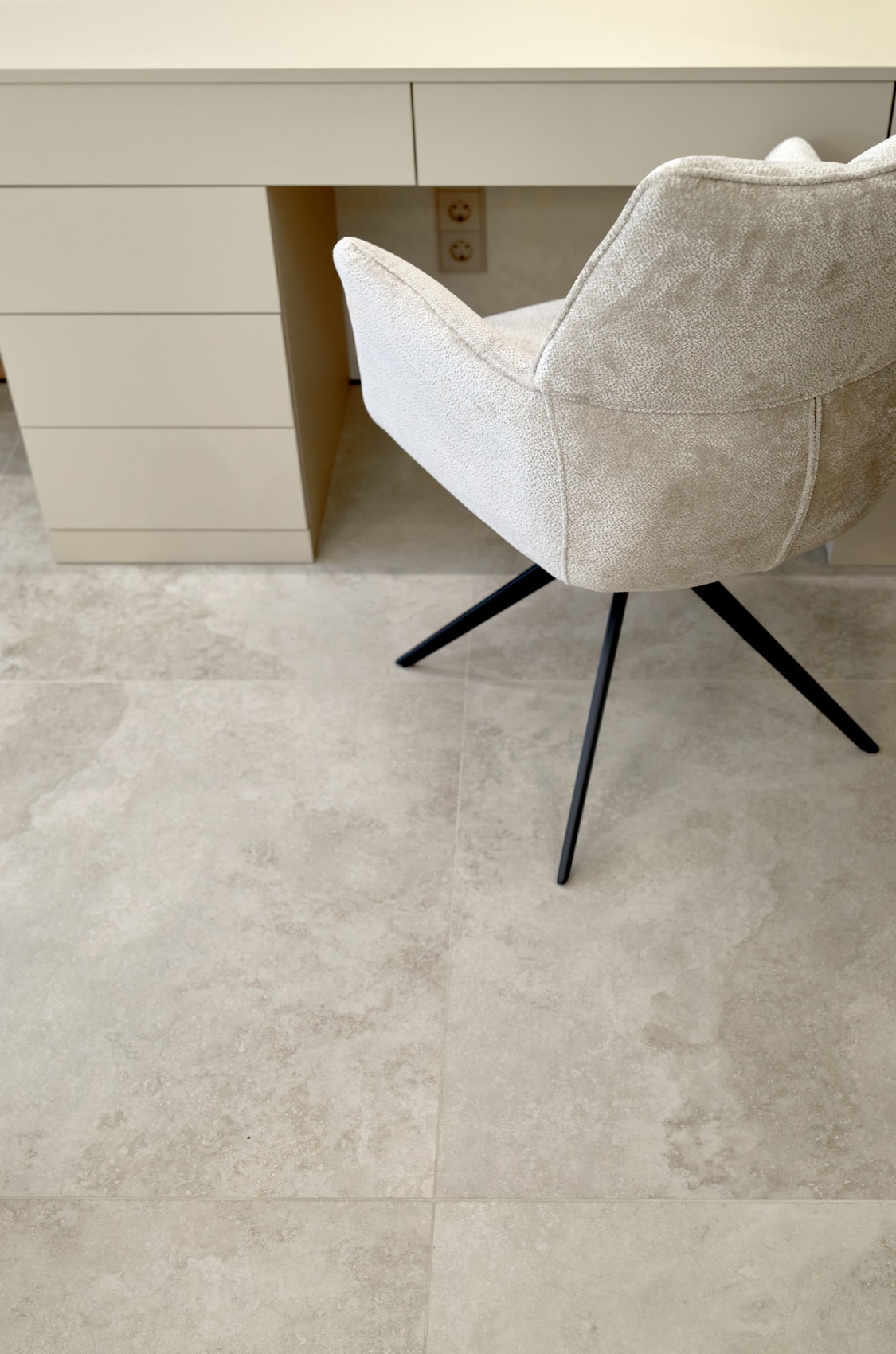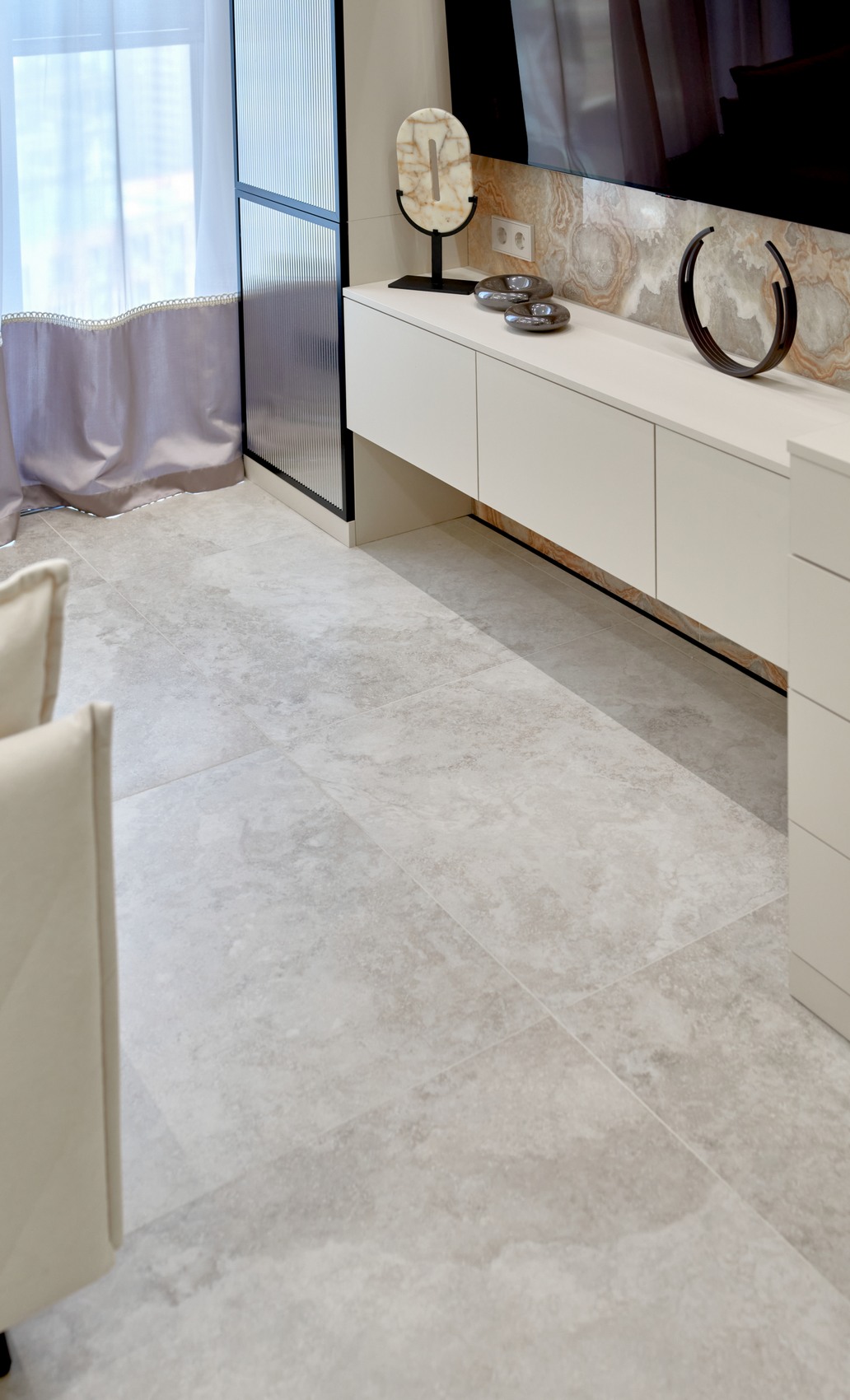В качестве напольного покрытия уложен керамогранит Italon Wonderful Life Almond формат 600х600 под натуральный камень, создающий стильный и дорогой интерьер.