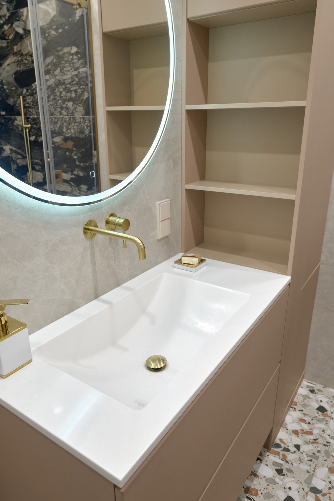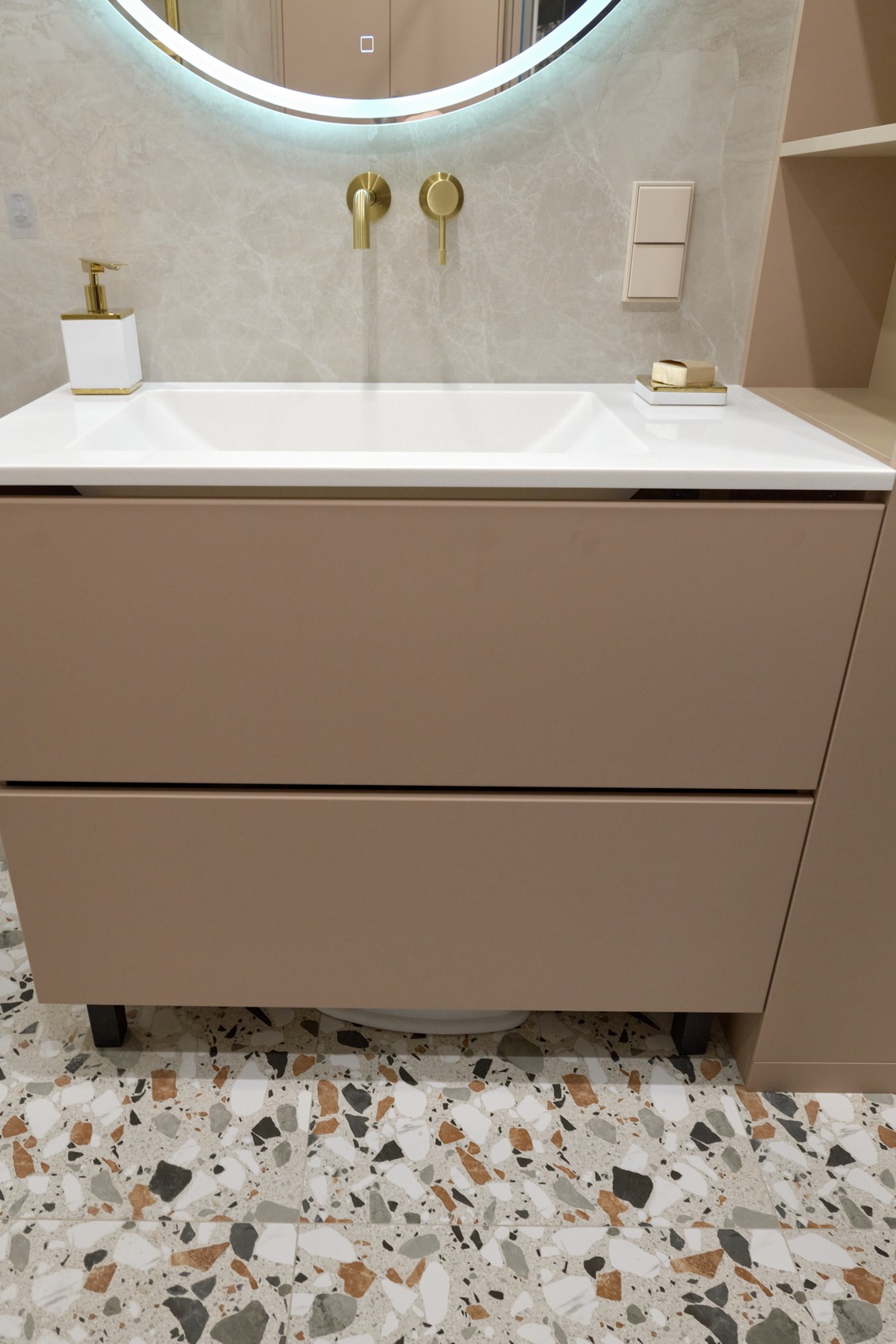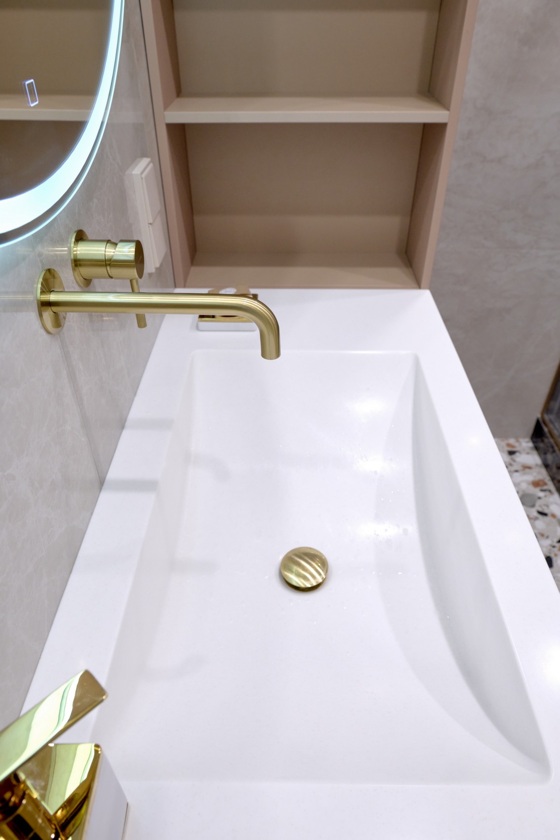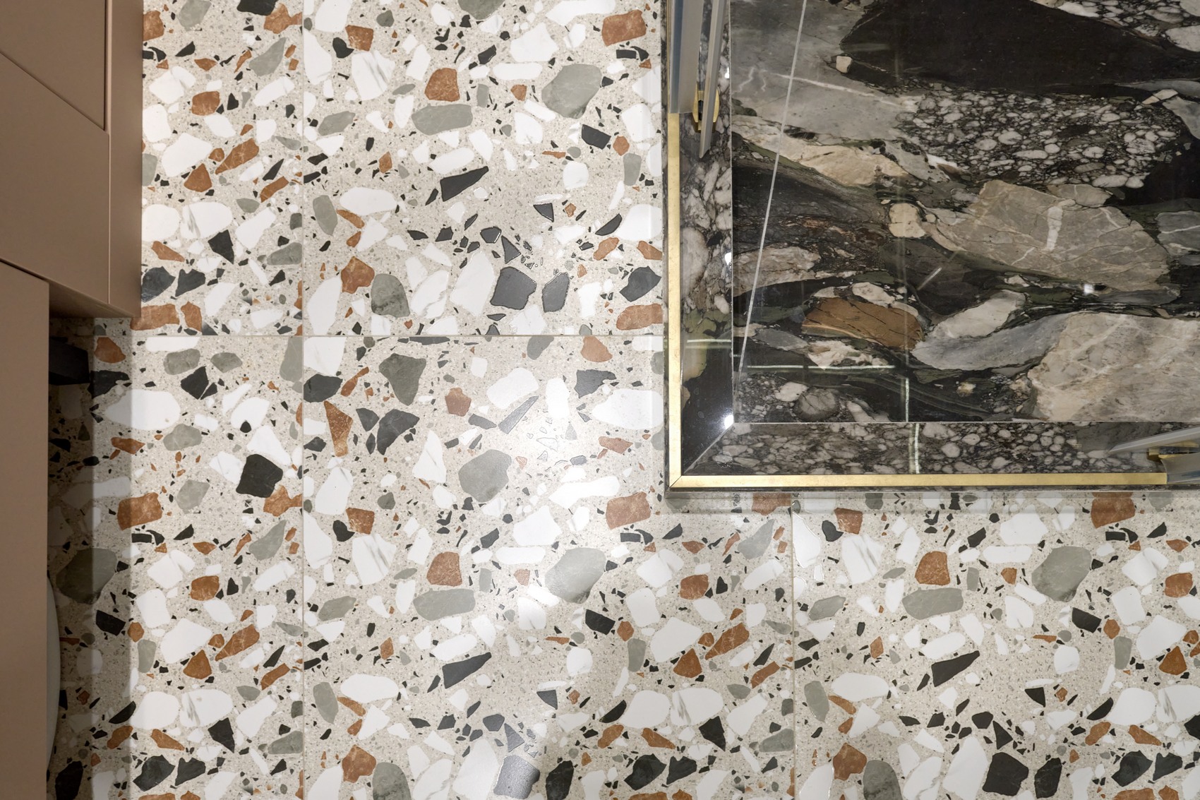 В качестве напольного покрытия уложен керамогранит Italon Wonderful Life Almond формат 600х600 под натуральный камень, создающий стильный и дорогой интерьер.