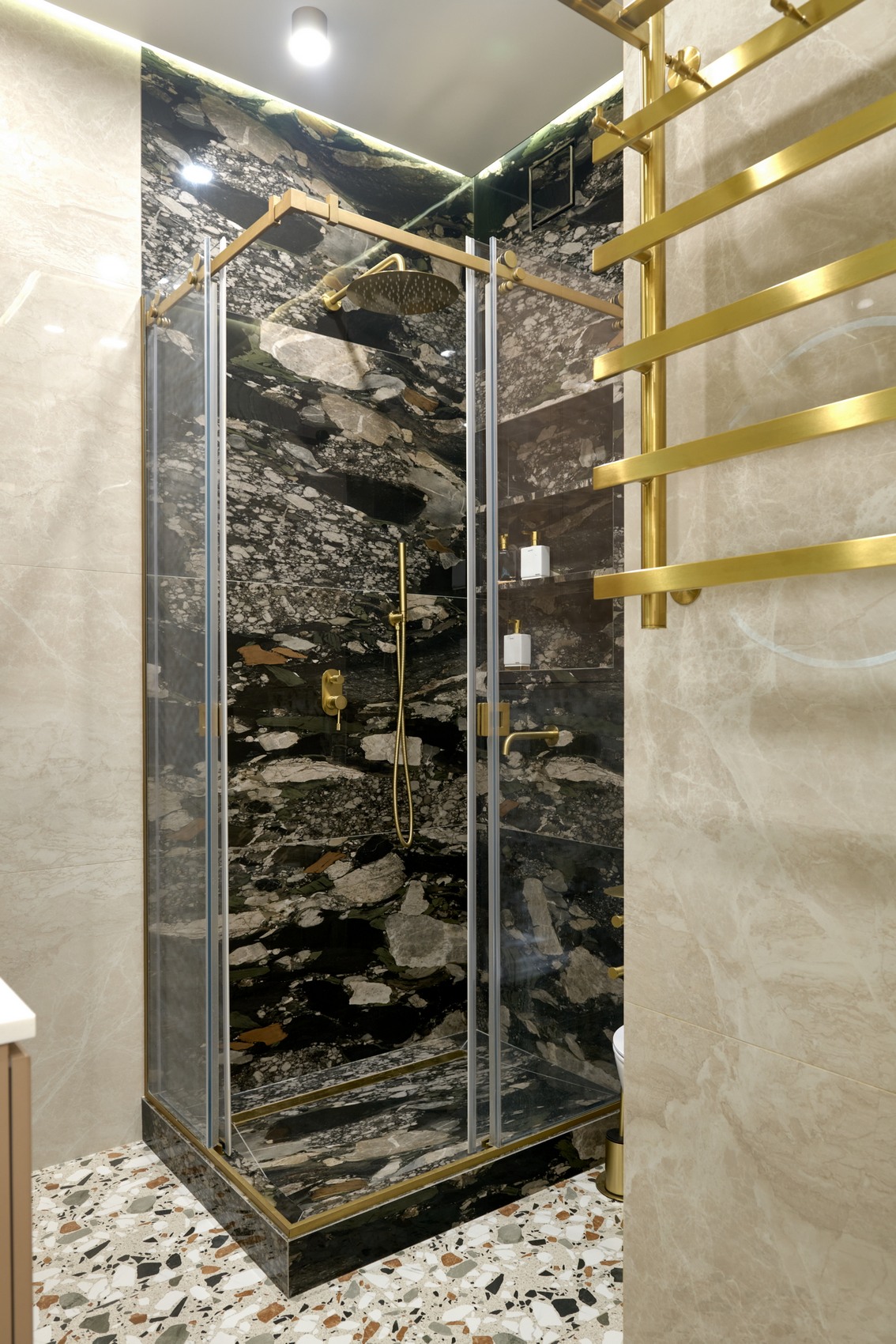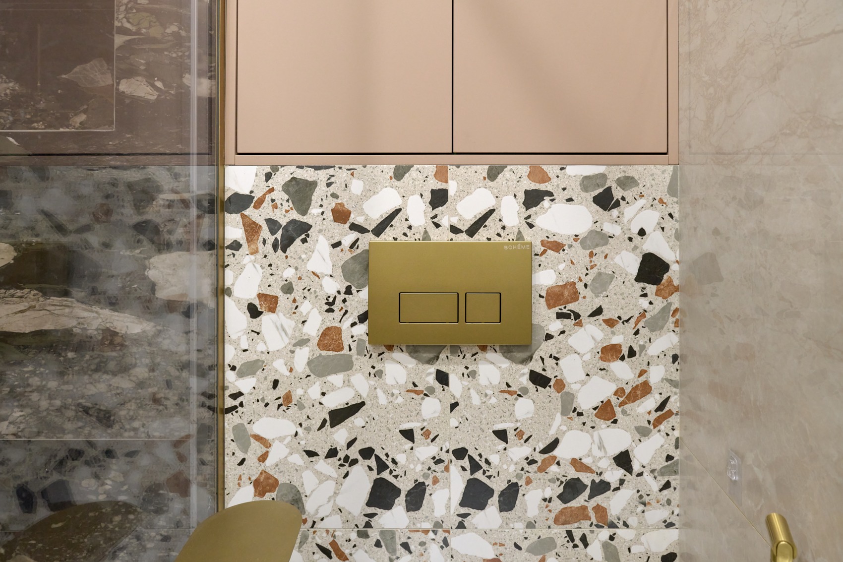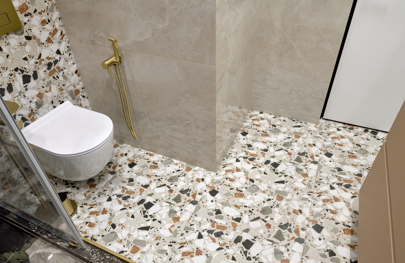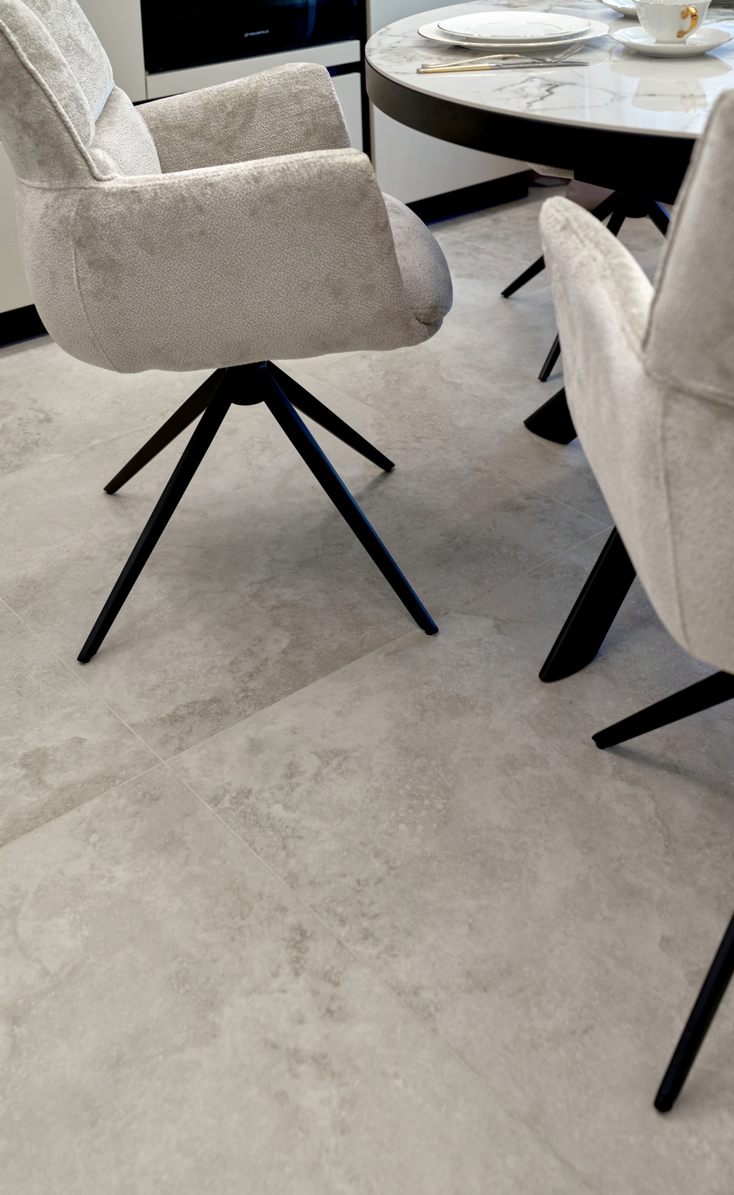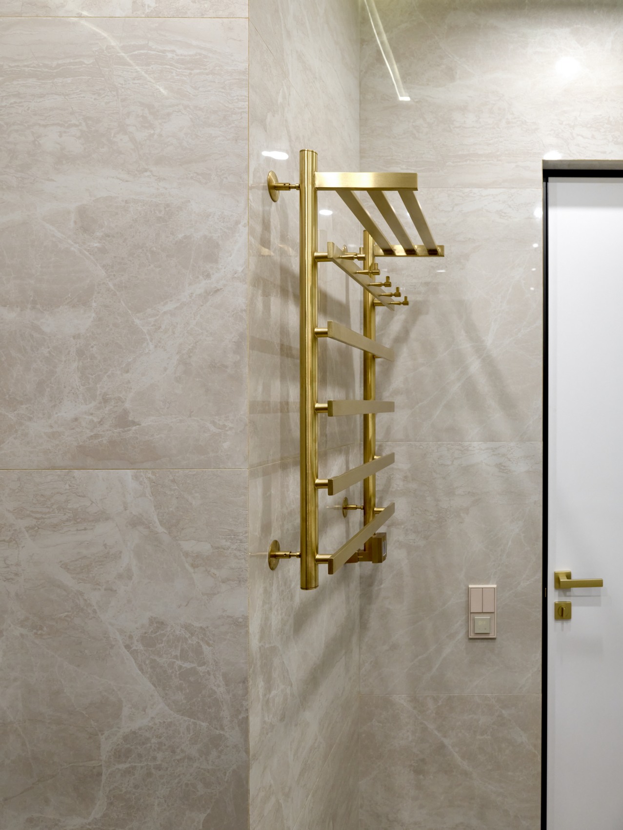 В качестве напольного покрытия уложен керамогранит Italon Wonderful Life Almond формат 600х600 под натуральный камень, создающий стильный и дорогой интерьер.