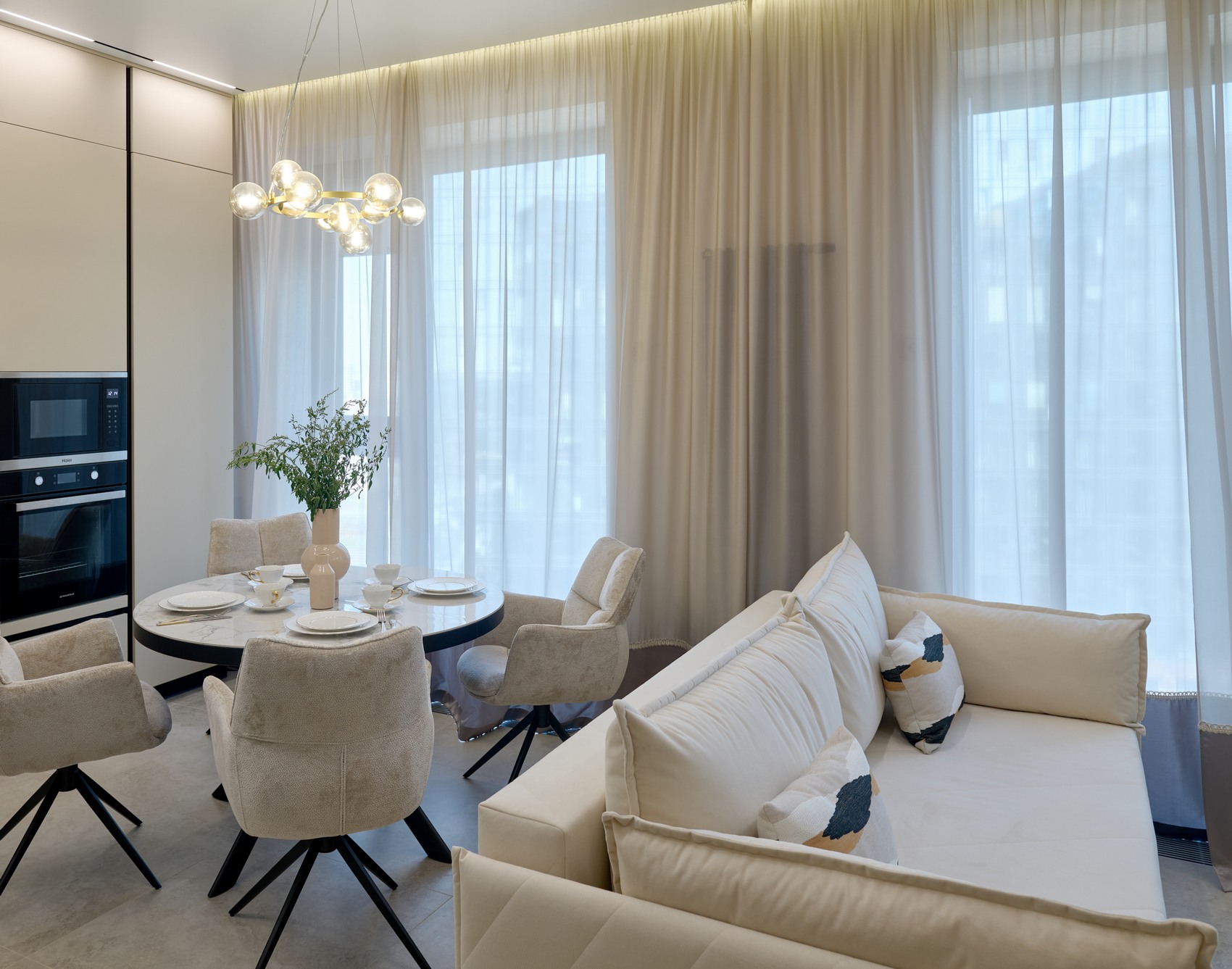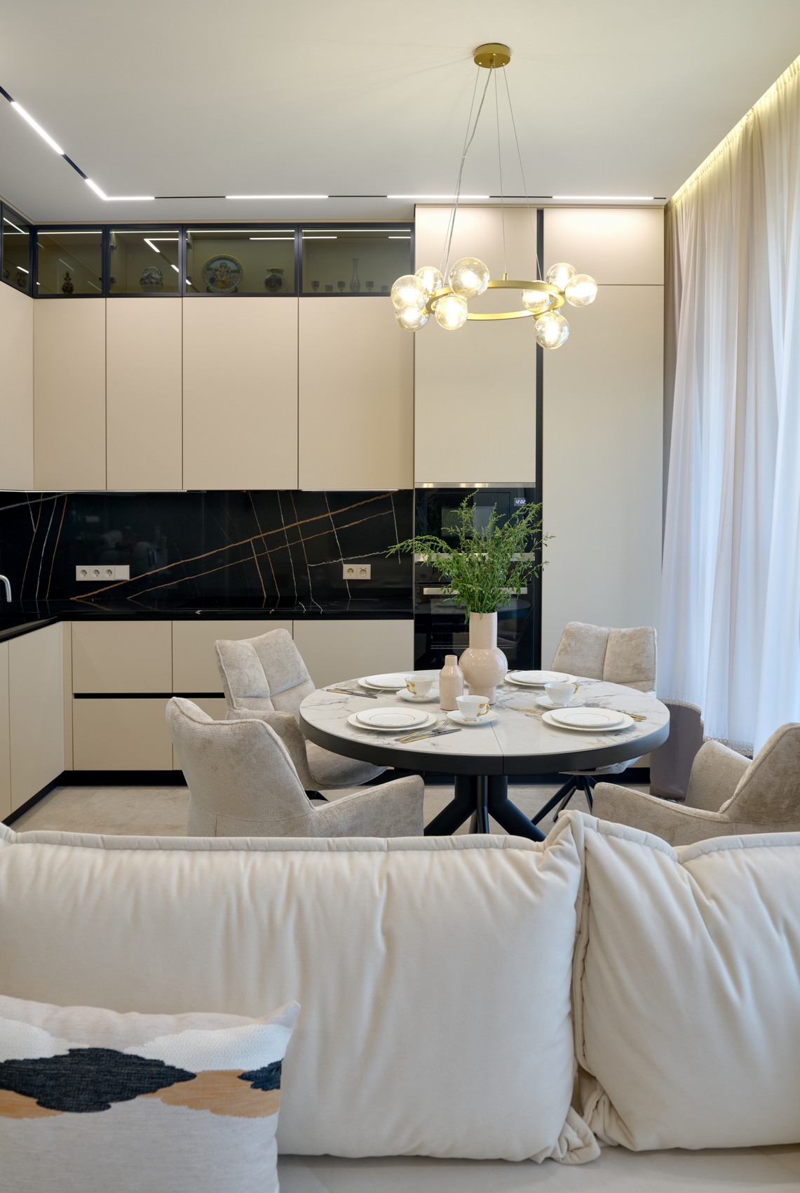 Кухня-гостиная наполнена естественным светом сквозь панорамные окна, который подчеркивает чистоту форм и безупречную гармонию интерьера.