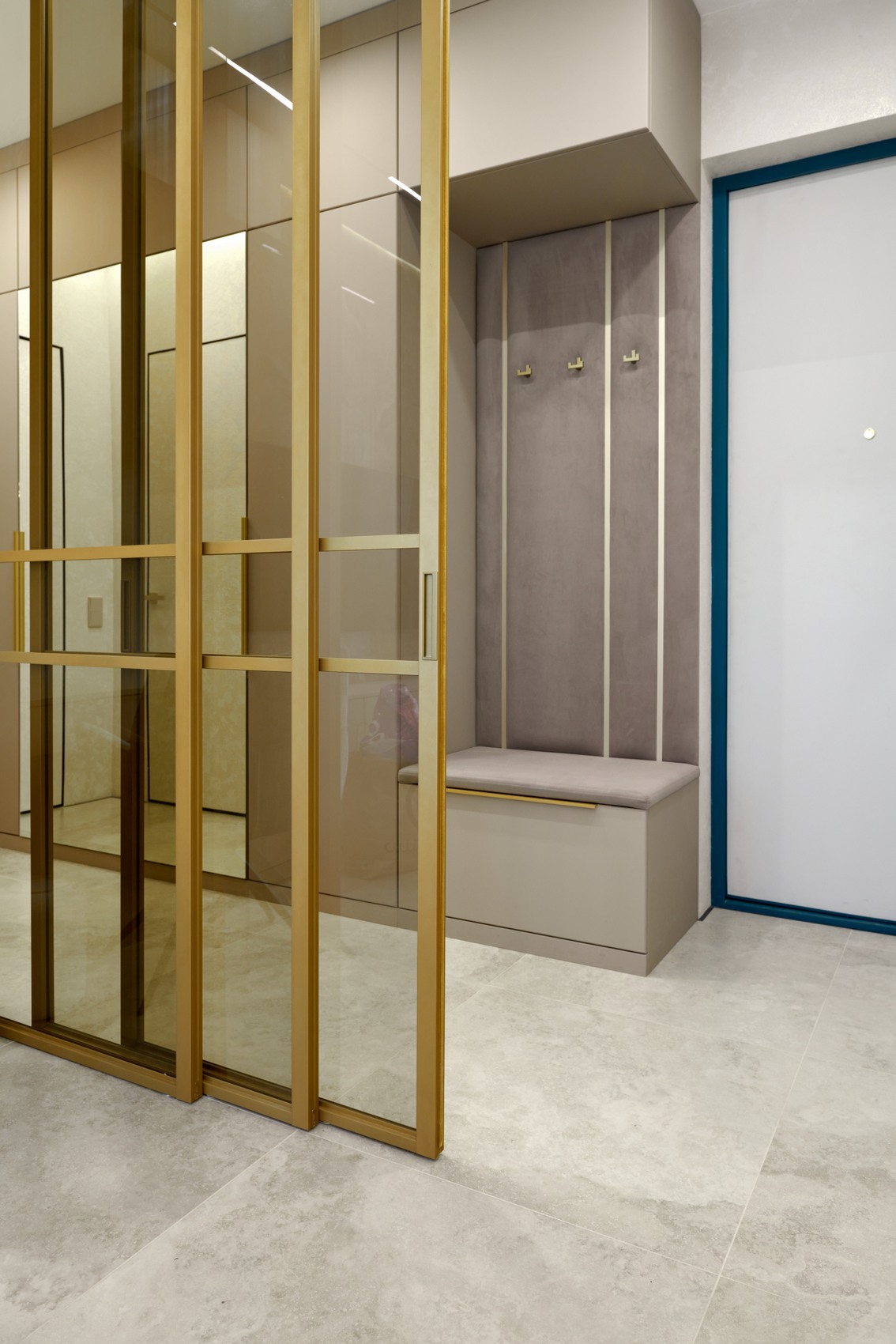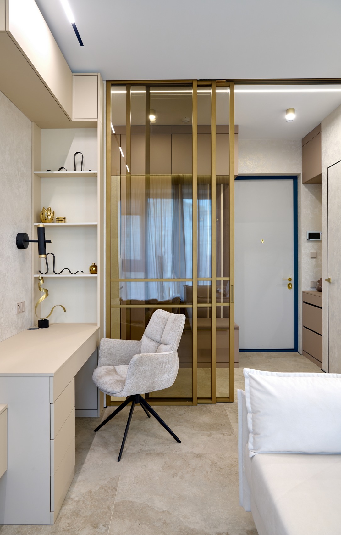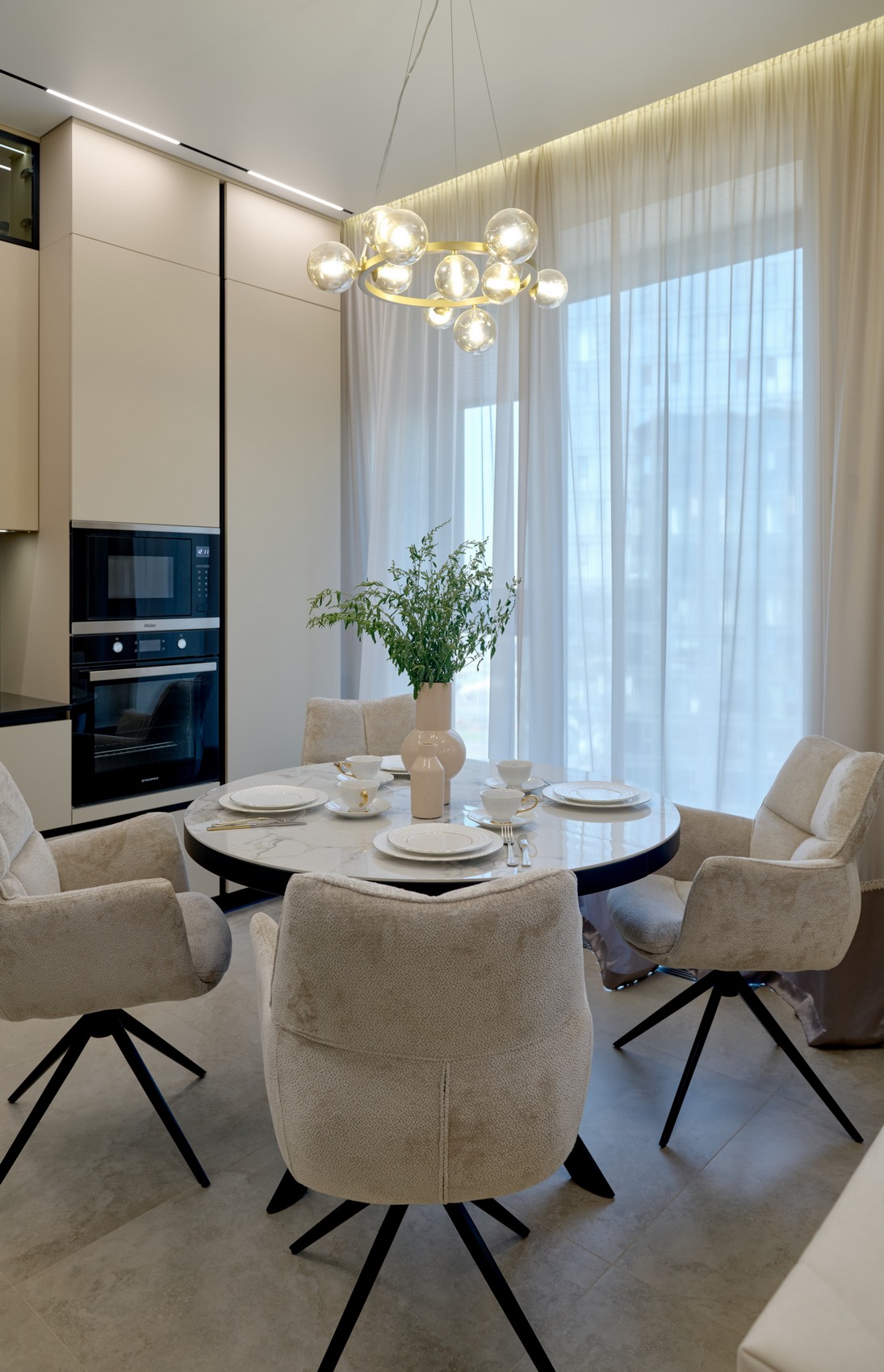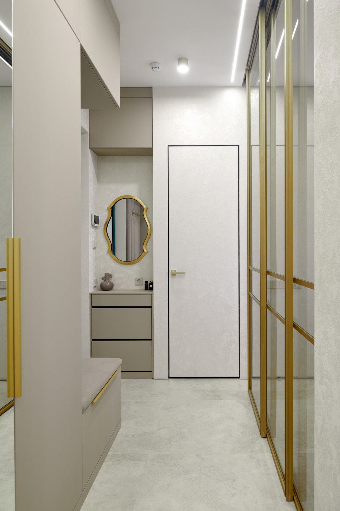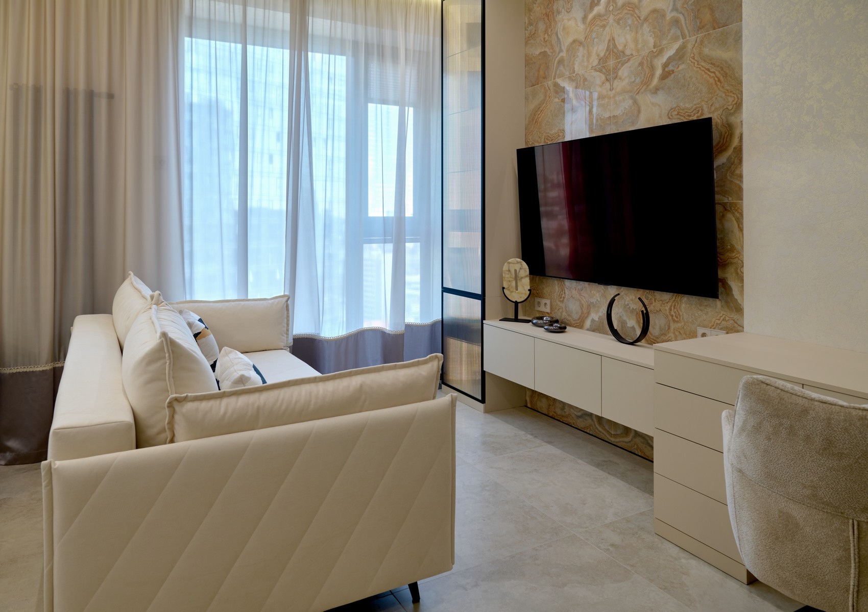 Элегантная квартира в современном стиле - минимализм, выполненная в светлых бежевых оттенках, создающих атмосферу простора и спокойствия.
