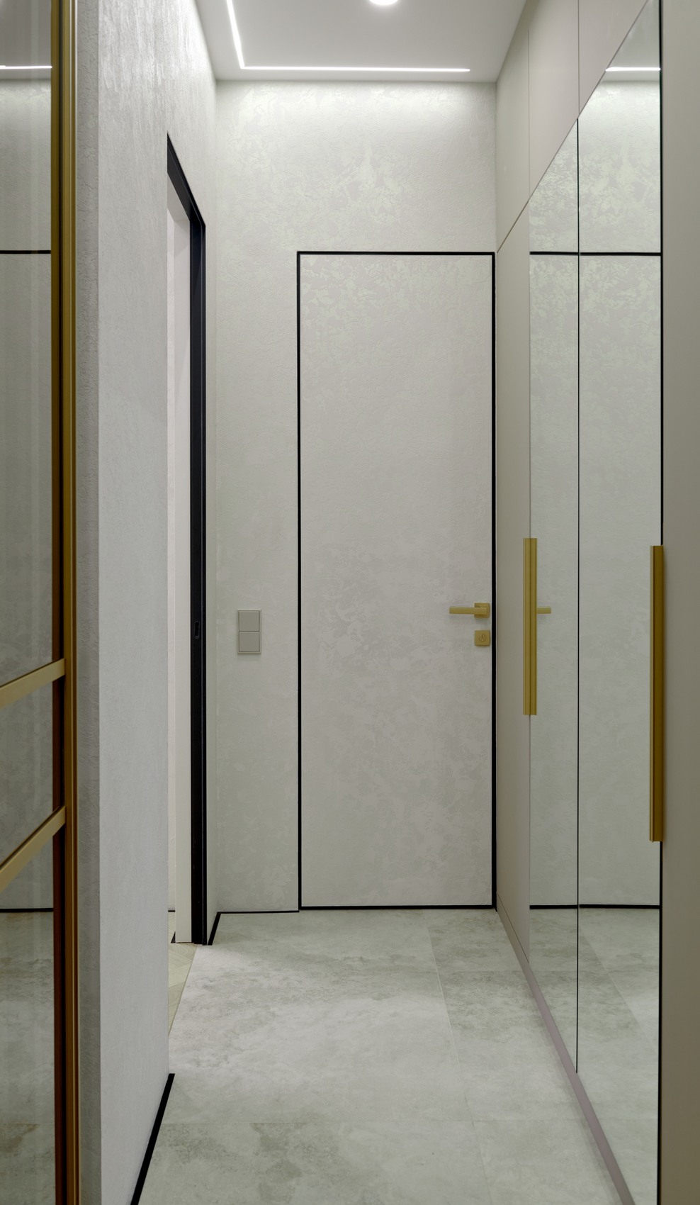 Одним из акцентов в помещении квартиры служит декоративная текстурная штукатурка на стенах, сохраняя при этом минимализм и лаконичность.