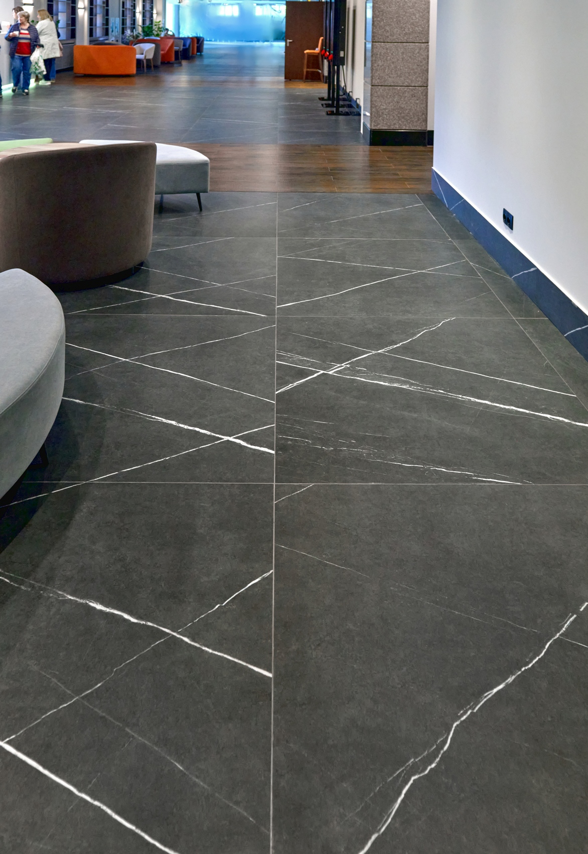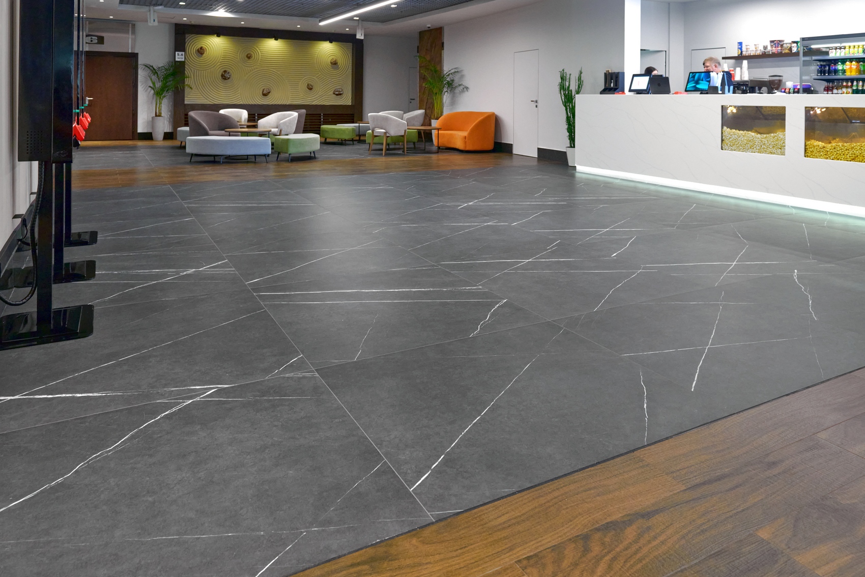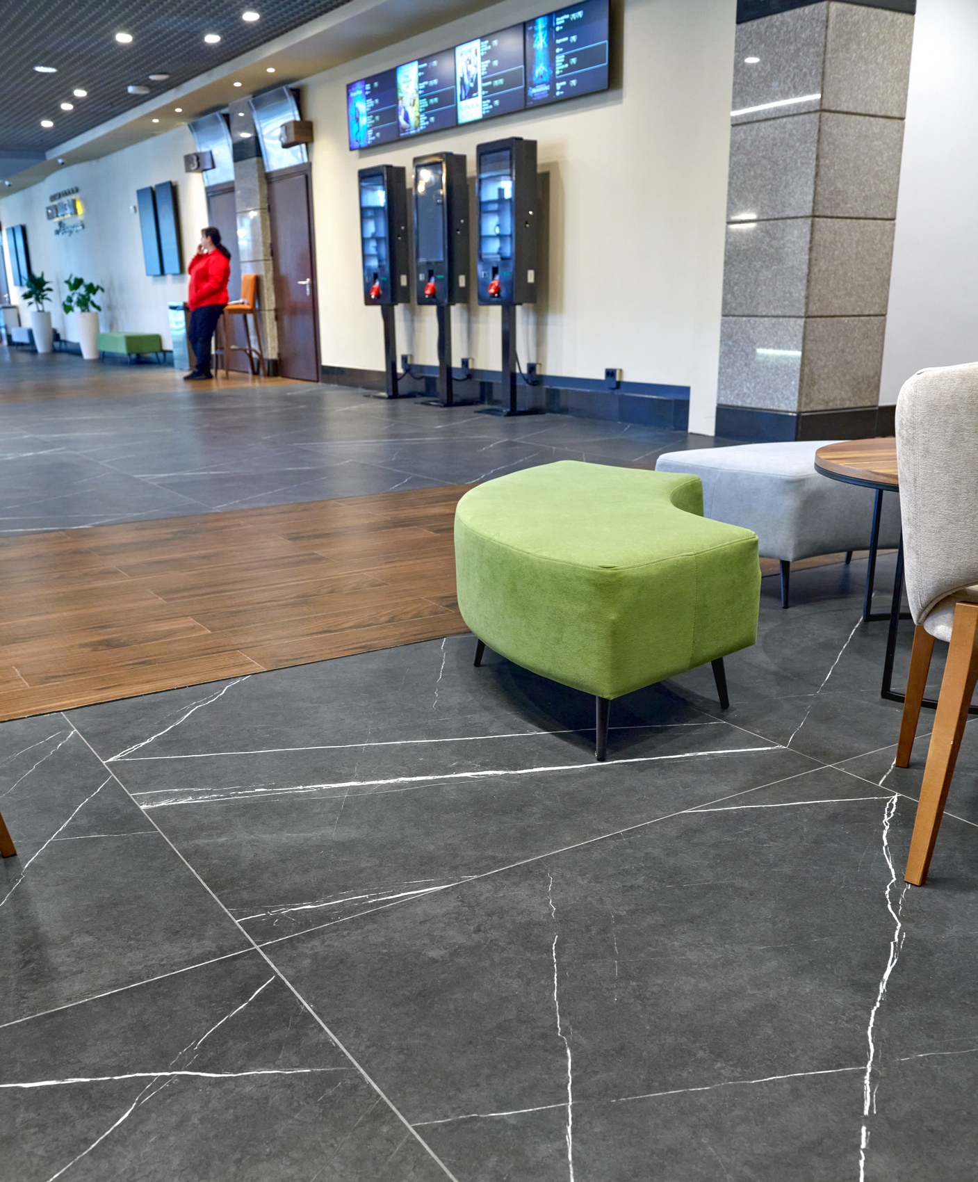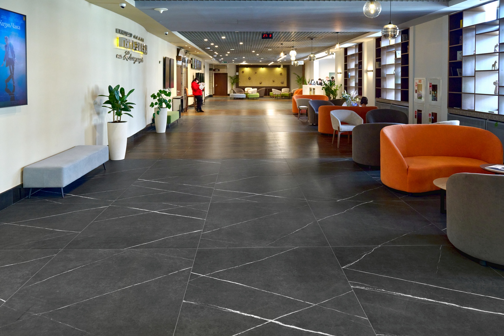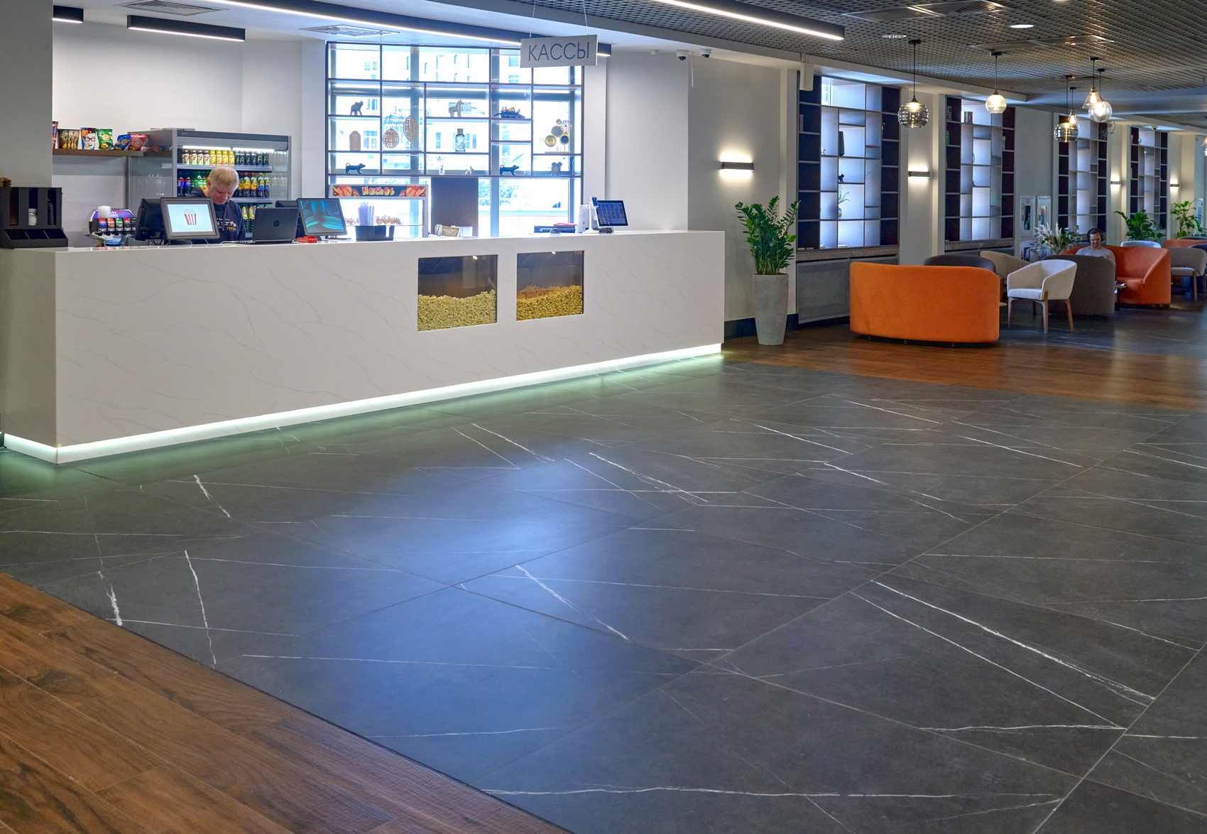 Пространство сочетает индустриальную эстетику с кинематографической атмосферой: открытые конструкции, игра света подчёркнуты напольным покрытием из коллекции Metropolis.