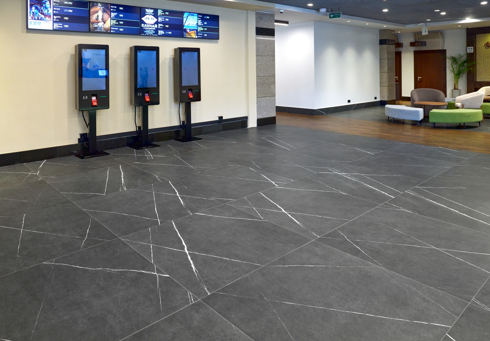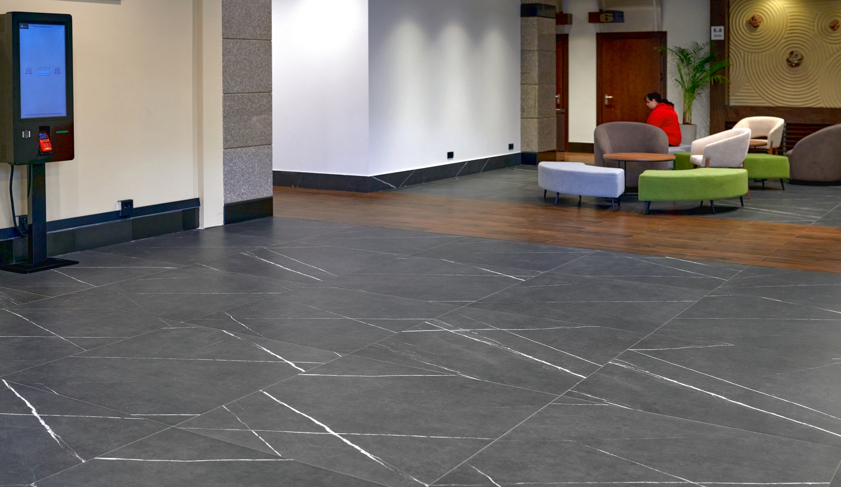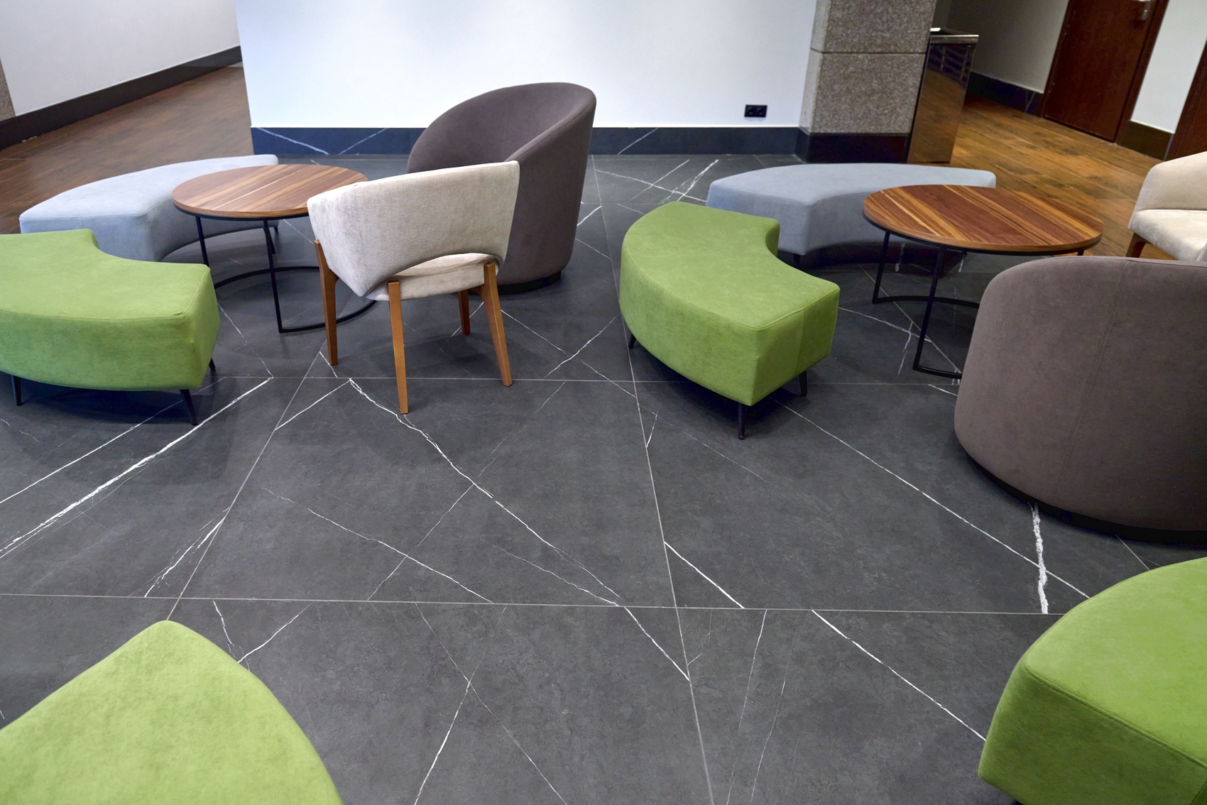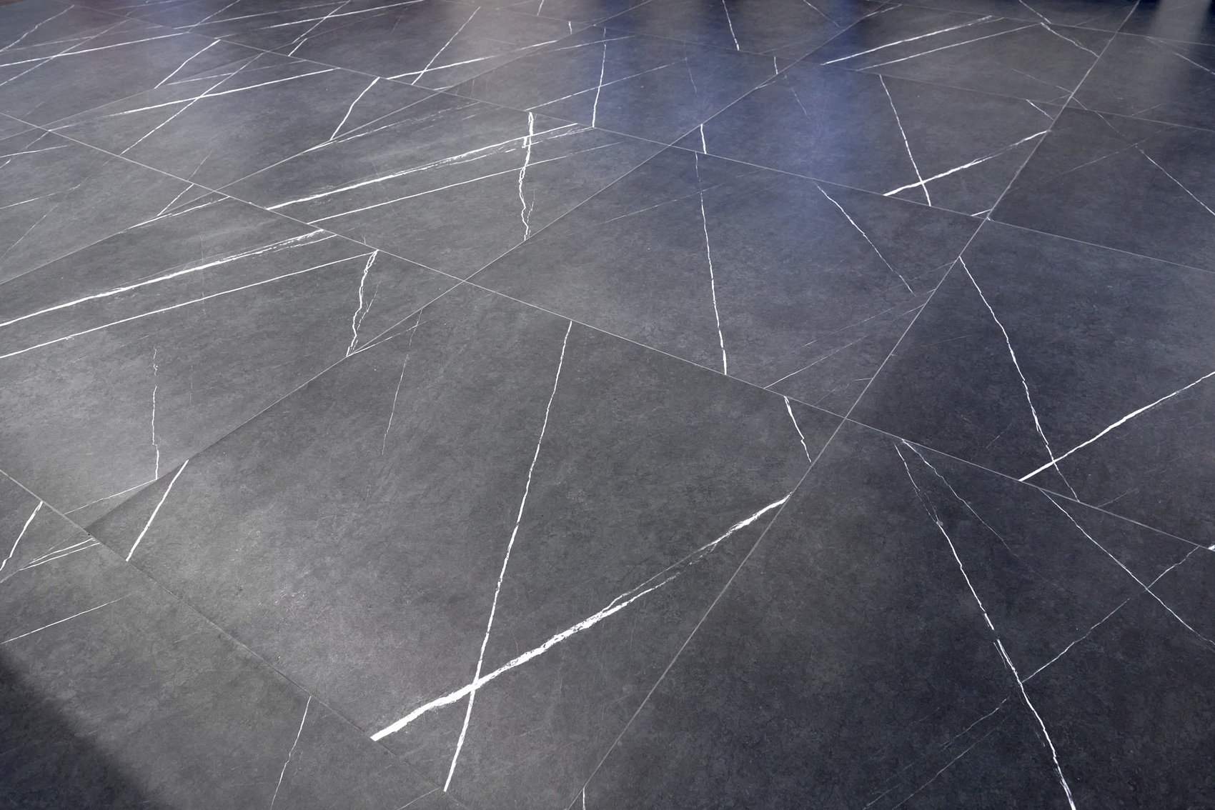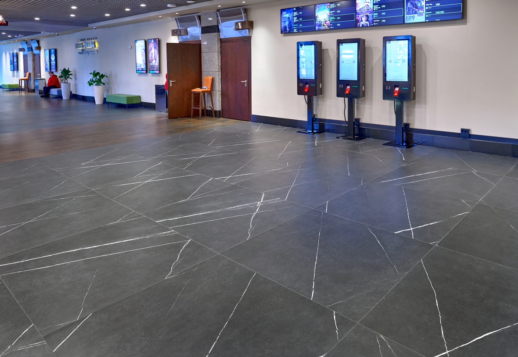 Пространство сочетает индустриальную эстетику с кинематографической атмосферой: открытые конструкции, игра света подчёркнуты напольным покрытием из коллекции Metropolis.