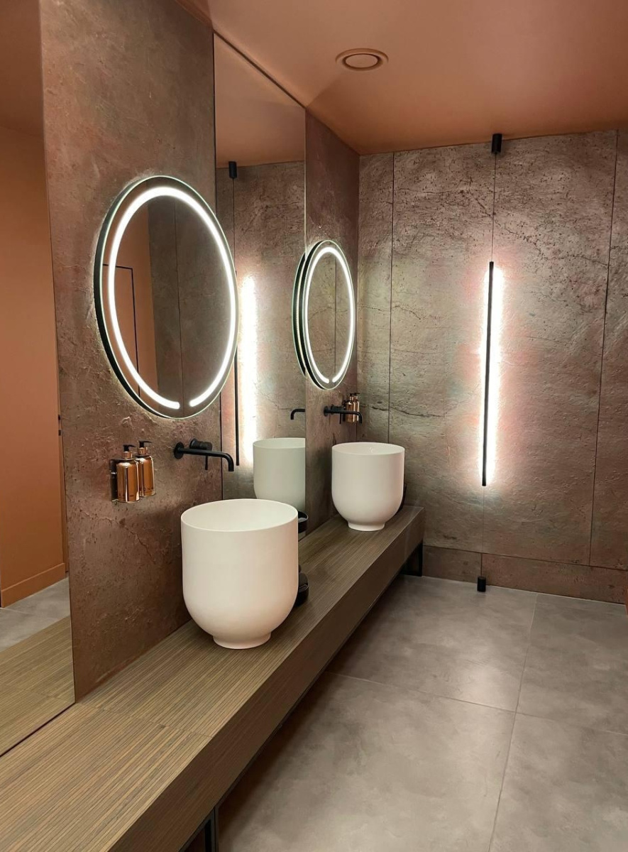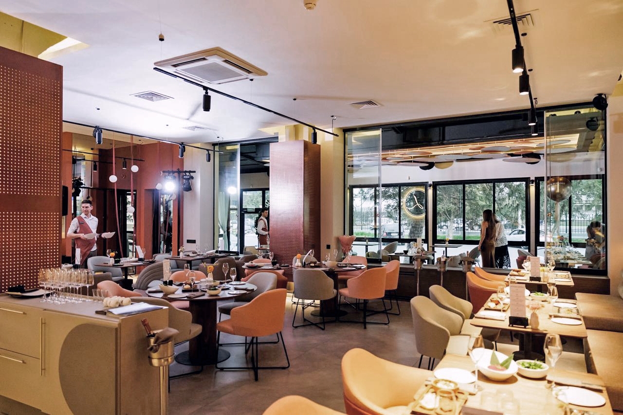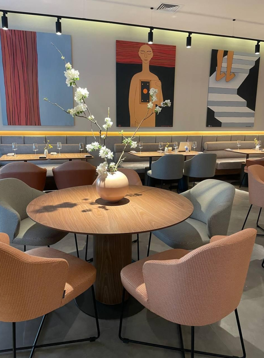 Дизайн ресторана впечатляет своим современным минимализмом и гармонией материалов.