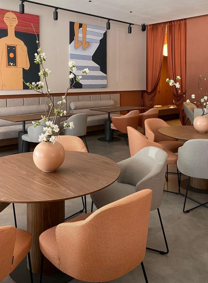 Этот керамогранит отличается высокой износостойкостью, что делает его идеальным решением для общественных помещений, таких как рестораны. Он создает ощущение массивного натурального камня, гармонирующего с мягкими цветами мебели и текстурой стен. Полы в сочетании с приглушёнными тонами обивки кресел и стен создают эффект уютного и стильного пространства, где каждая деталь тщательно продумана.