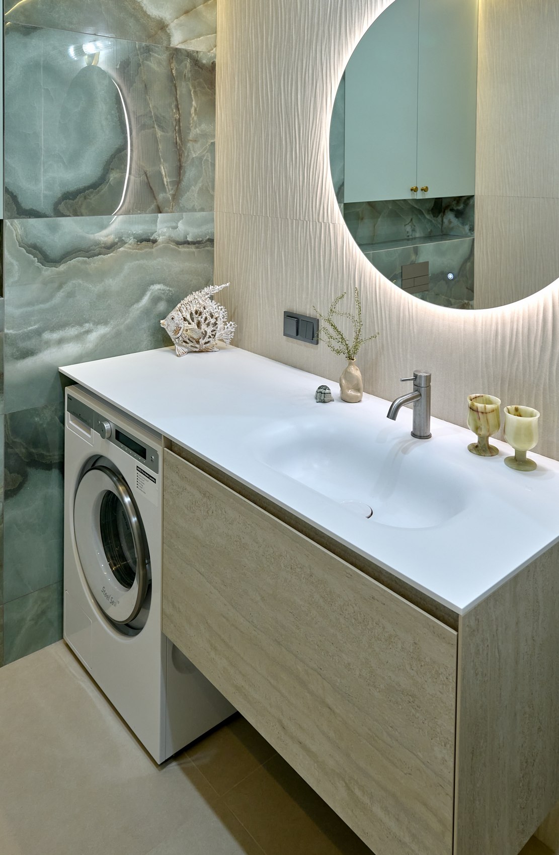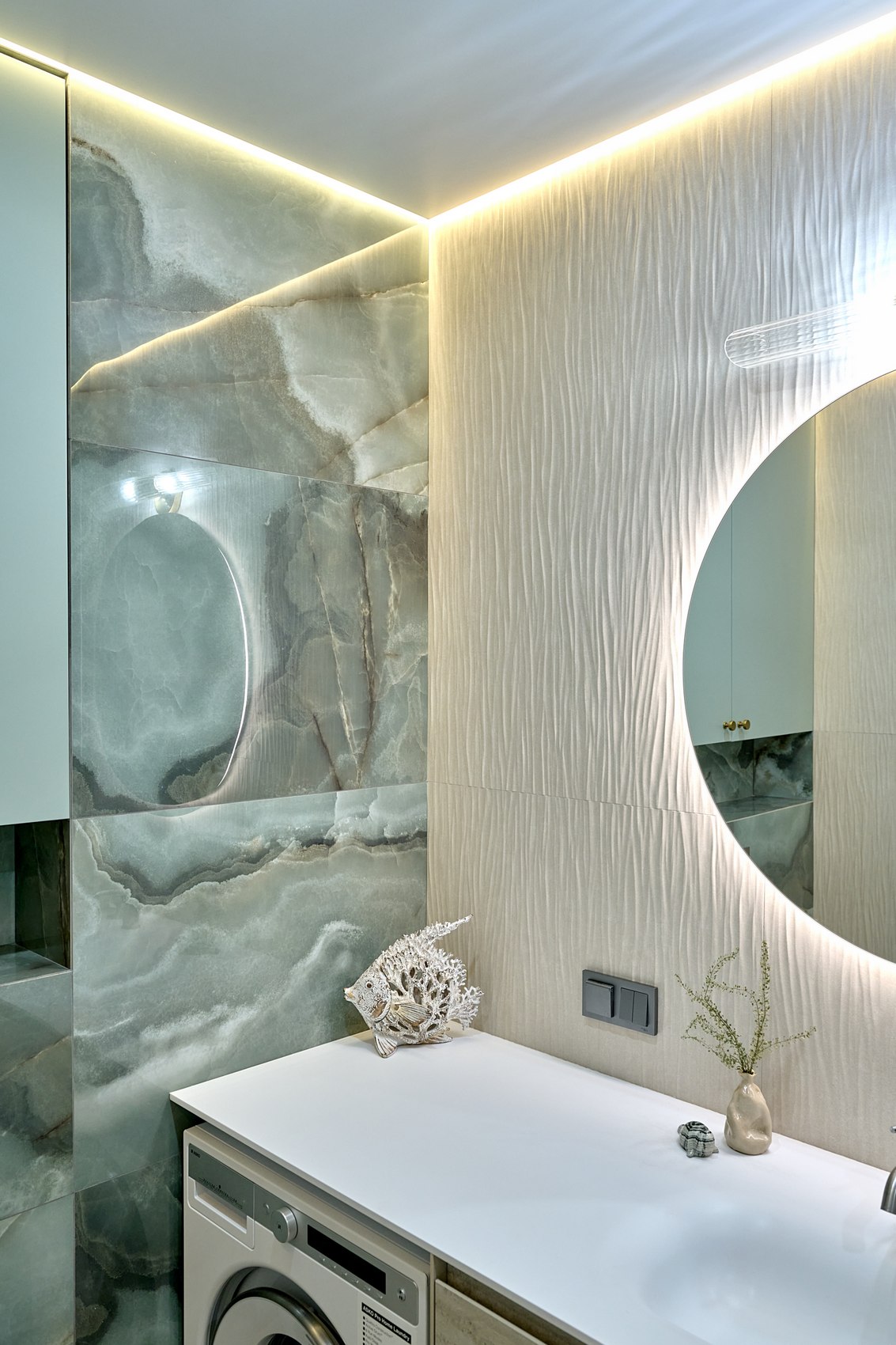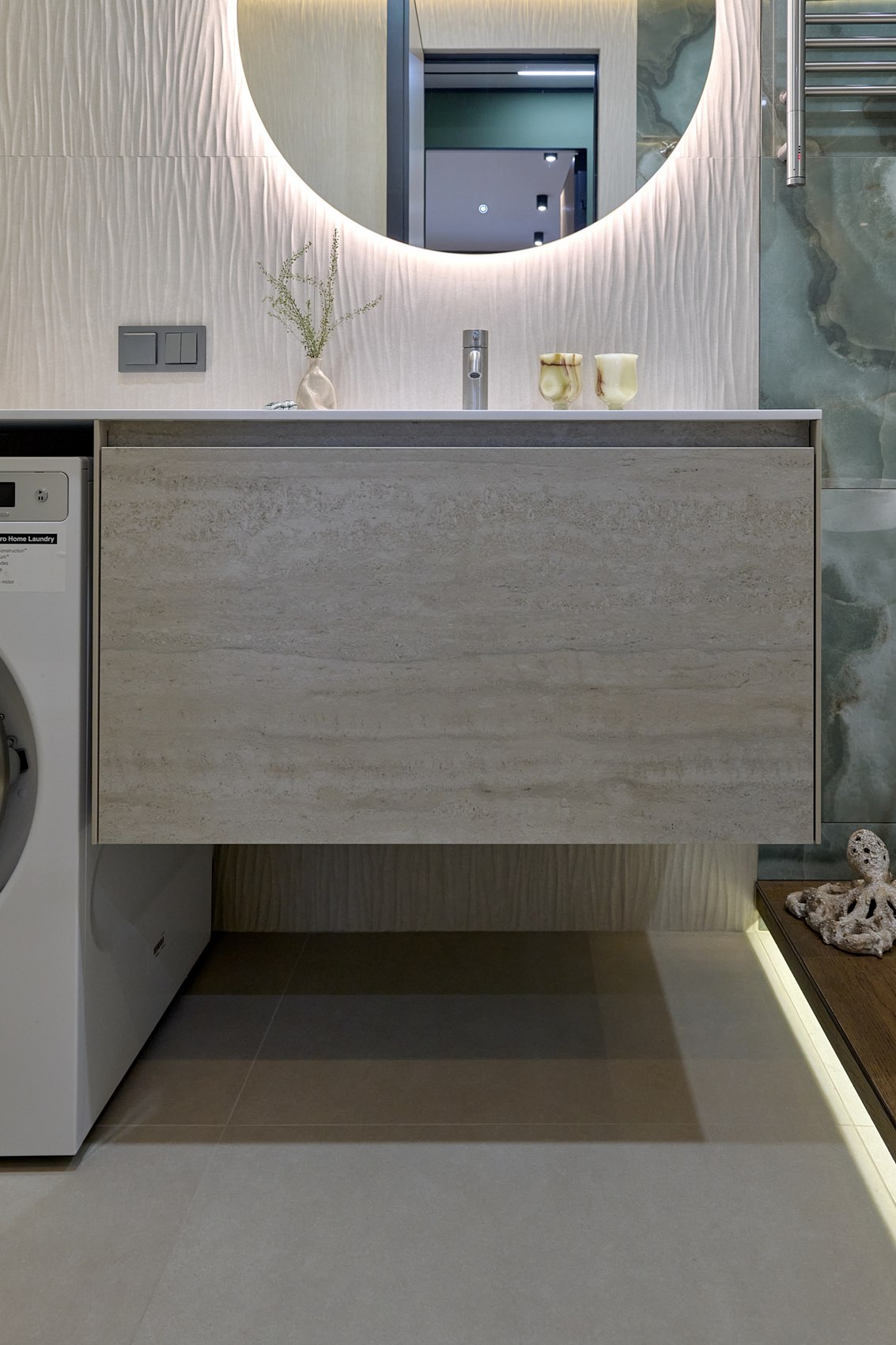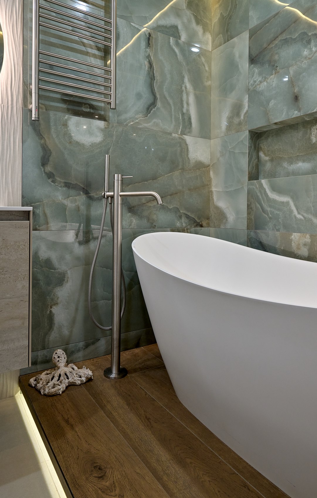 Санузел с отдельно стоящей ванной мы визуально разделили на две части. В верхней части помещения (подиум с ванной) идеей была терраса с деревянным полом в окружении зелени (зеленый оникс Рекс). А в зоне раковины сделали спокойные бежевые оттенки на полу и стенах. Стены еще усложнили рельефным рисунком керамогранита. Обе части помещения работают на контрасте цвета, материалов, фактур, матовых и глянцевых поверхностей.