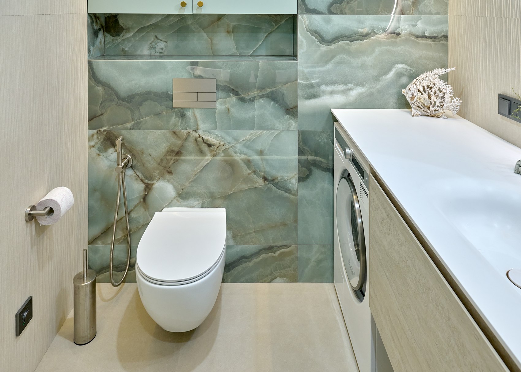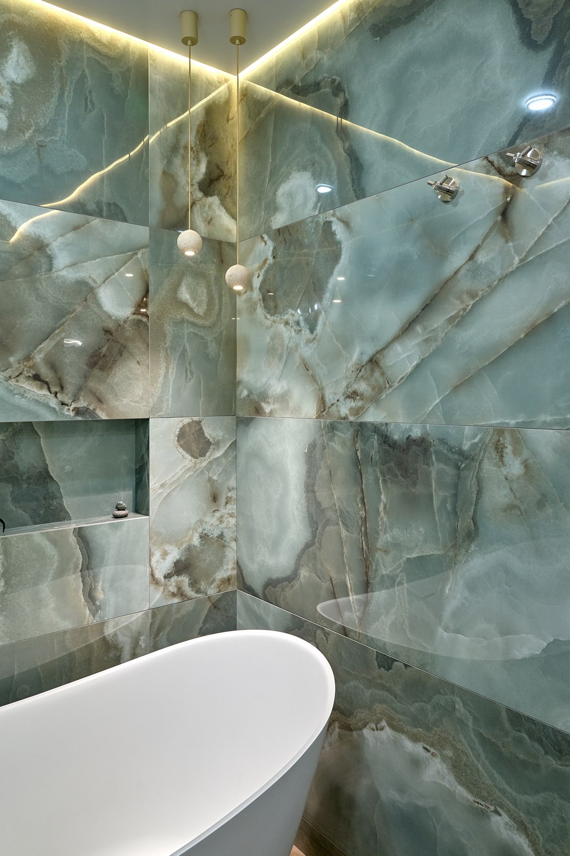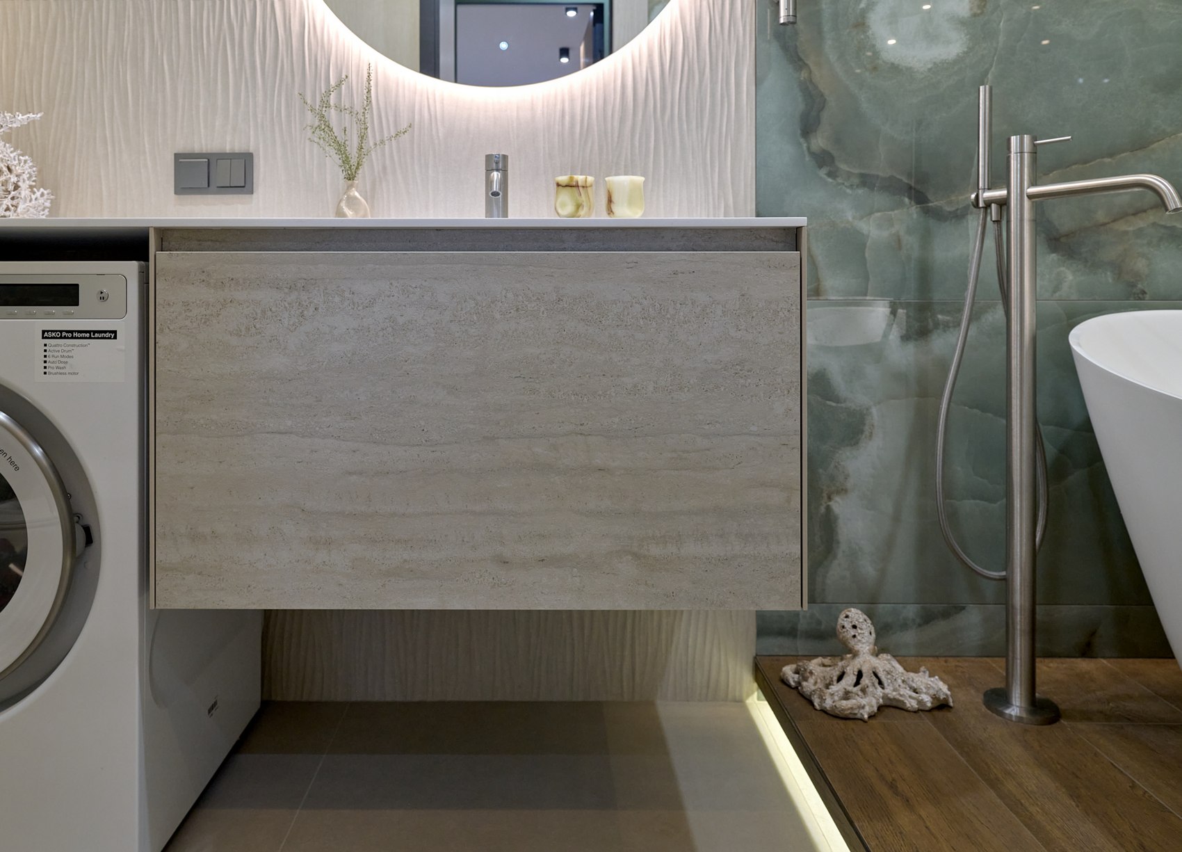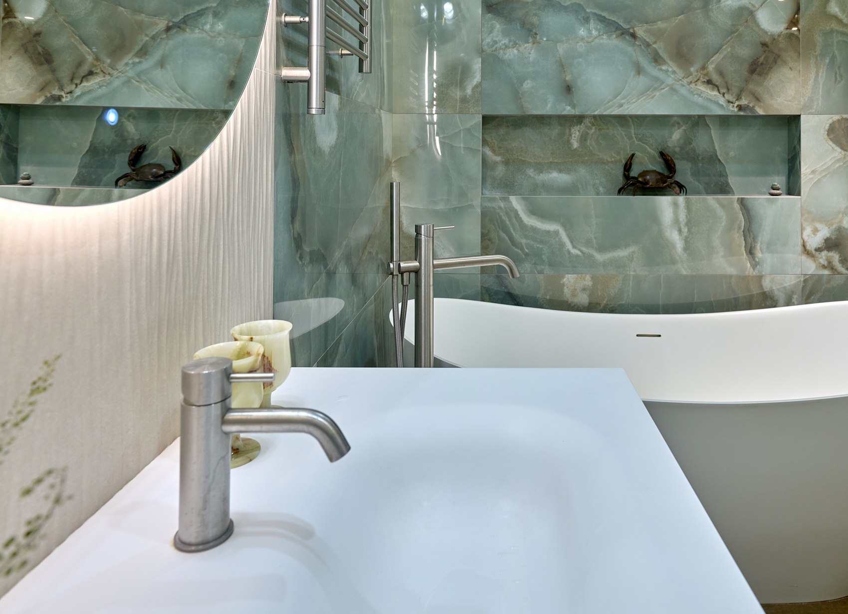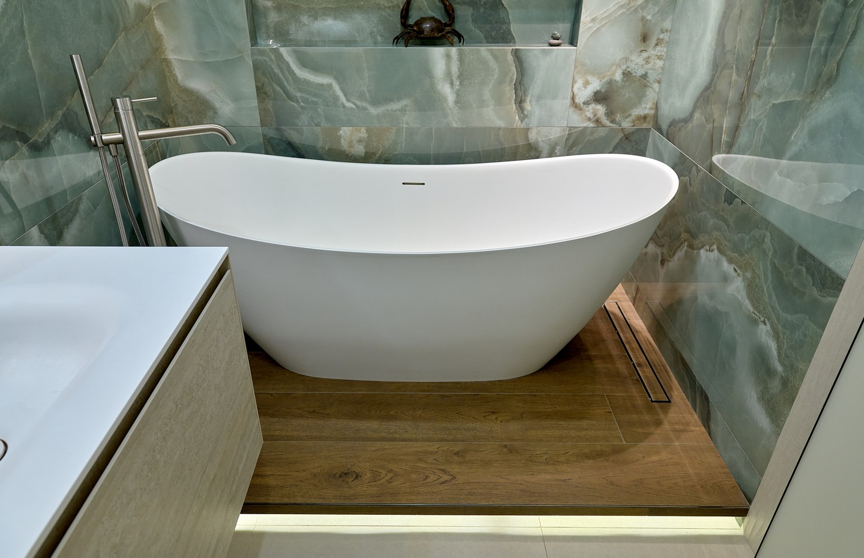 Санузел с отдельно стоящей ванной мы визуально разделили на две части. В верхней части помещения (подиум с ванной) идеей была терраса с деревянным полом в окружении зелени (зеленый оникс Рекс). А в зоне раковины сделали спокойные бежевые оттенки на полу и стенах. Стены еще усложнили рельефным рисунком керамогранита. Обе части помещения работают на контрасте цвета, материалов, фактур, матовых и глянцевых поверхностей.