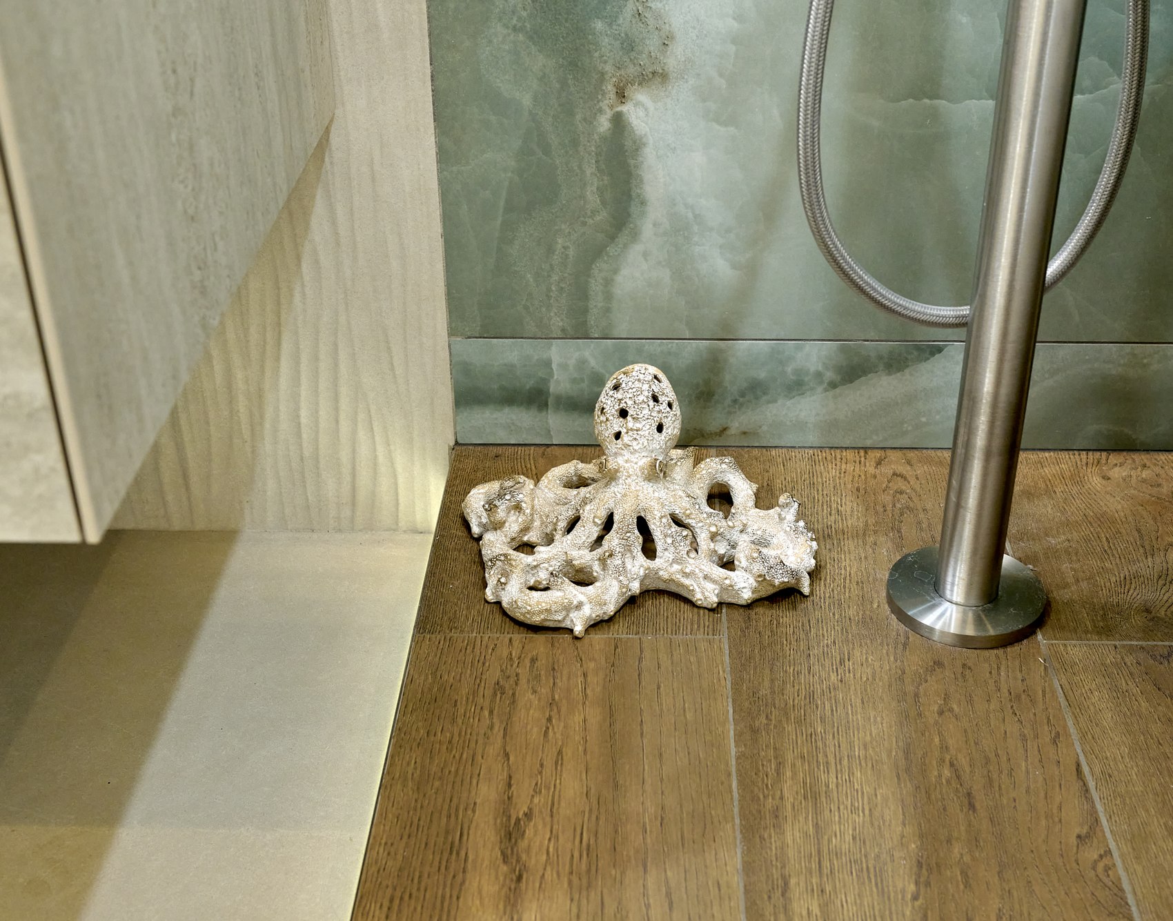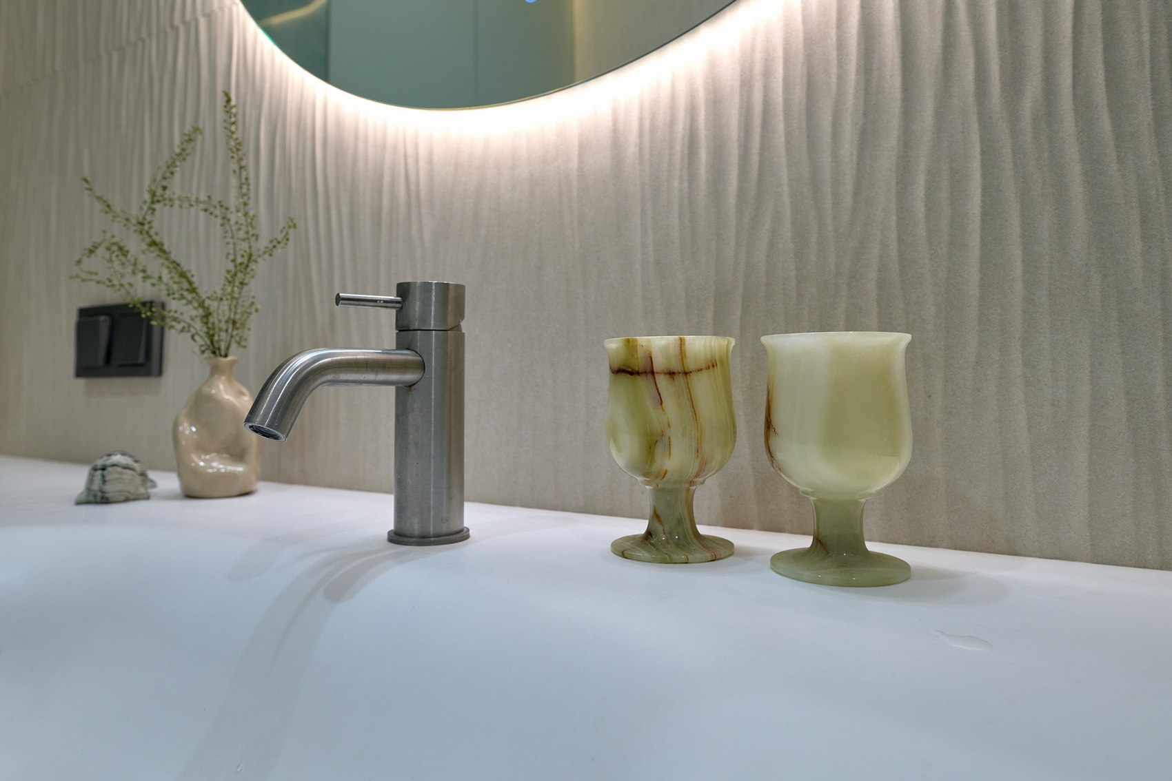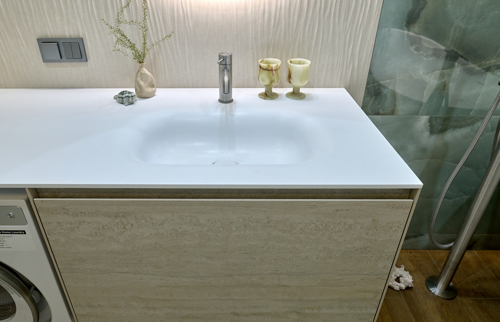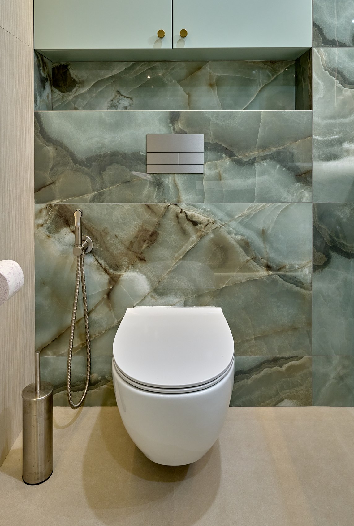 Санузел с отдельно стоящей ванной мы визуально разделили на две части. В верхней части помещения (подиум с ванной) идеей была терраса с деревянным полом в окружении зелени (зеленый оникс Рекс). А в зоне раковины сделали спокойные бежевые оттенки на полу и стенах. Стены еще усложнили рельефным рисунком керамогранита. Обе части помещения работают на контрасте цвета, материалов, фактур, матовых и глянцевых поверхностей.