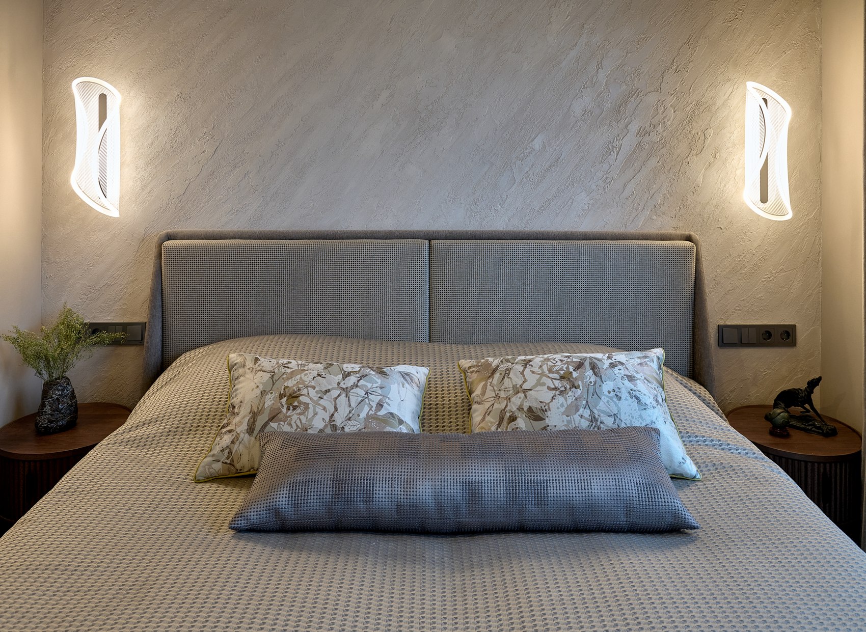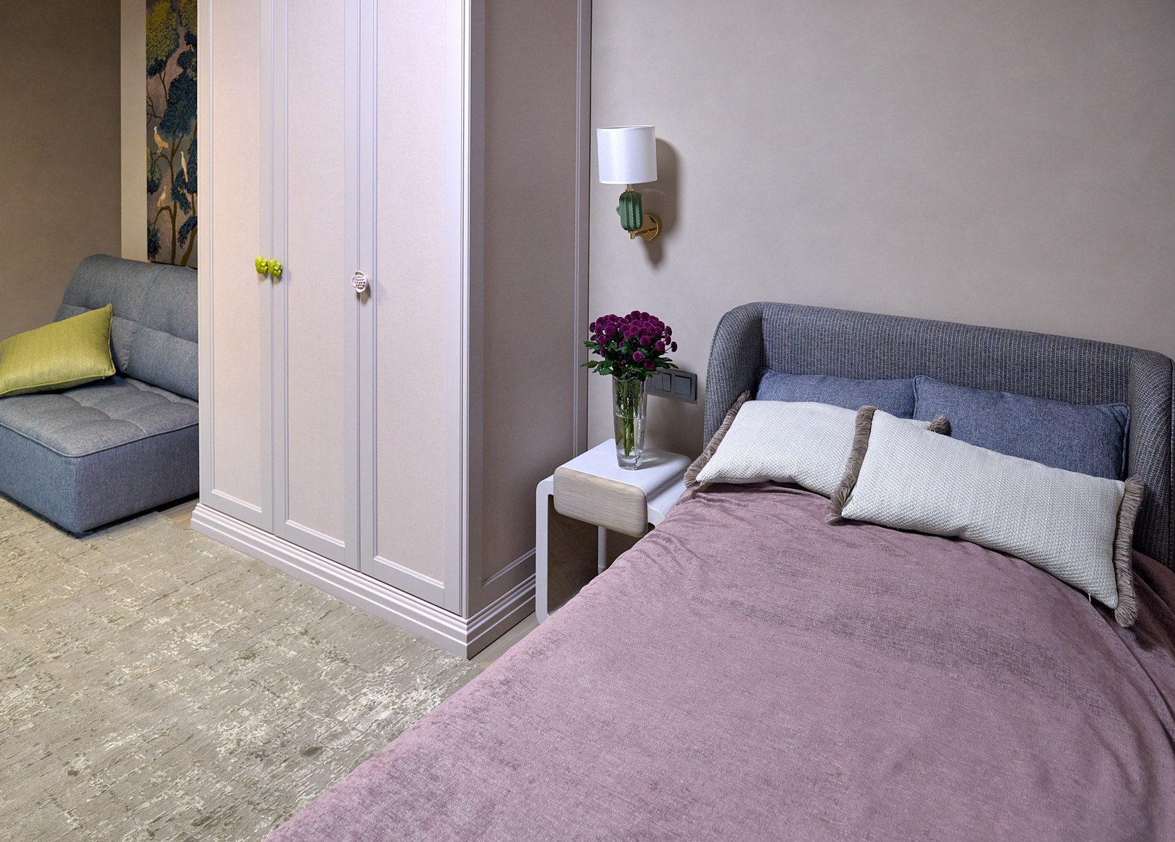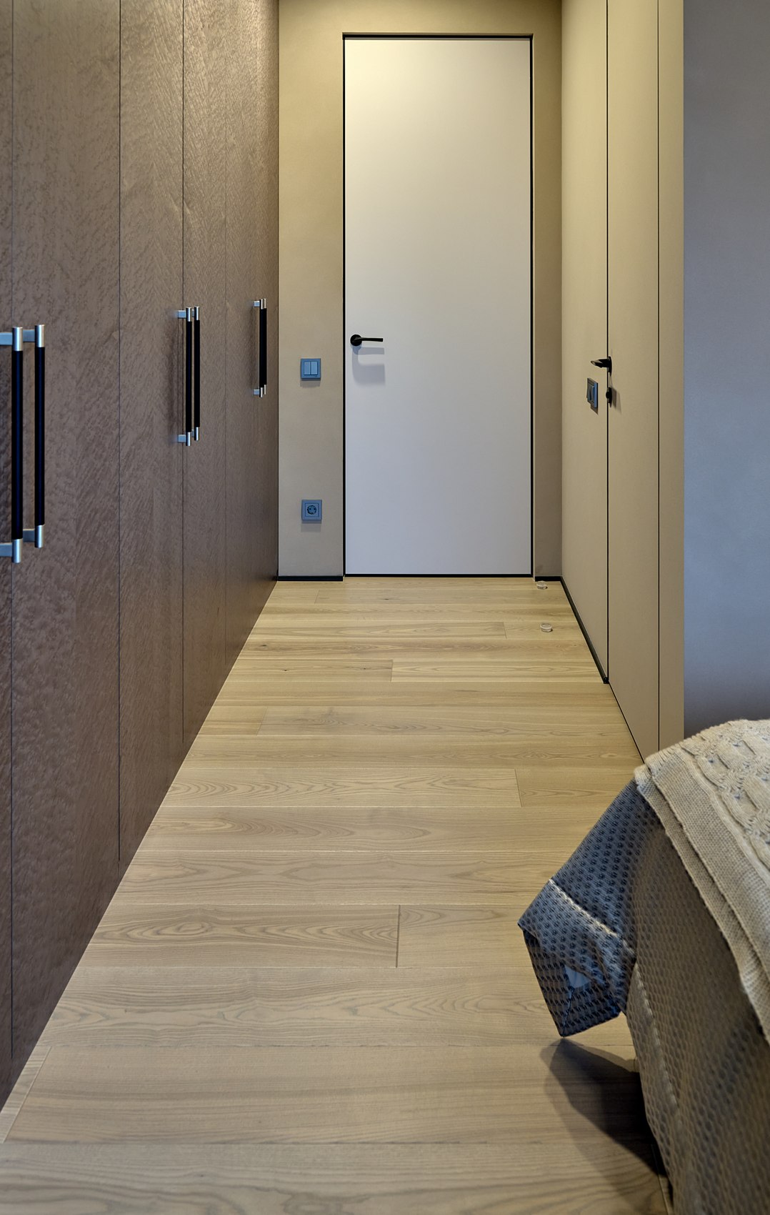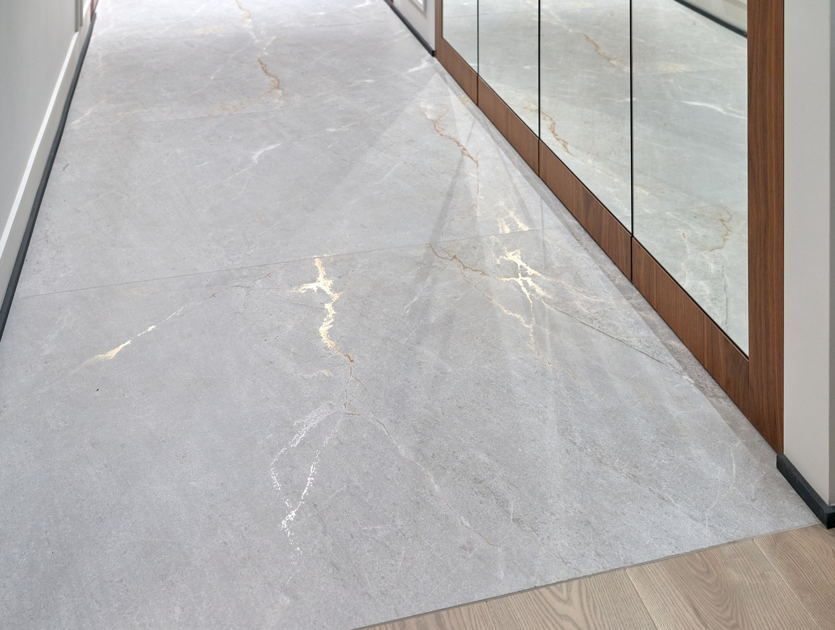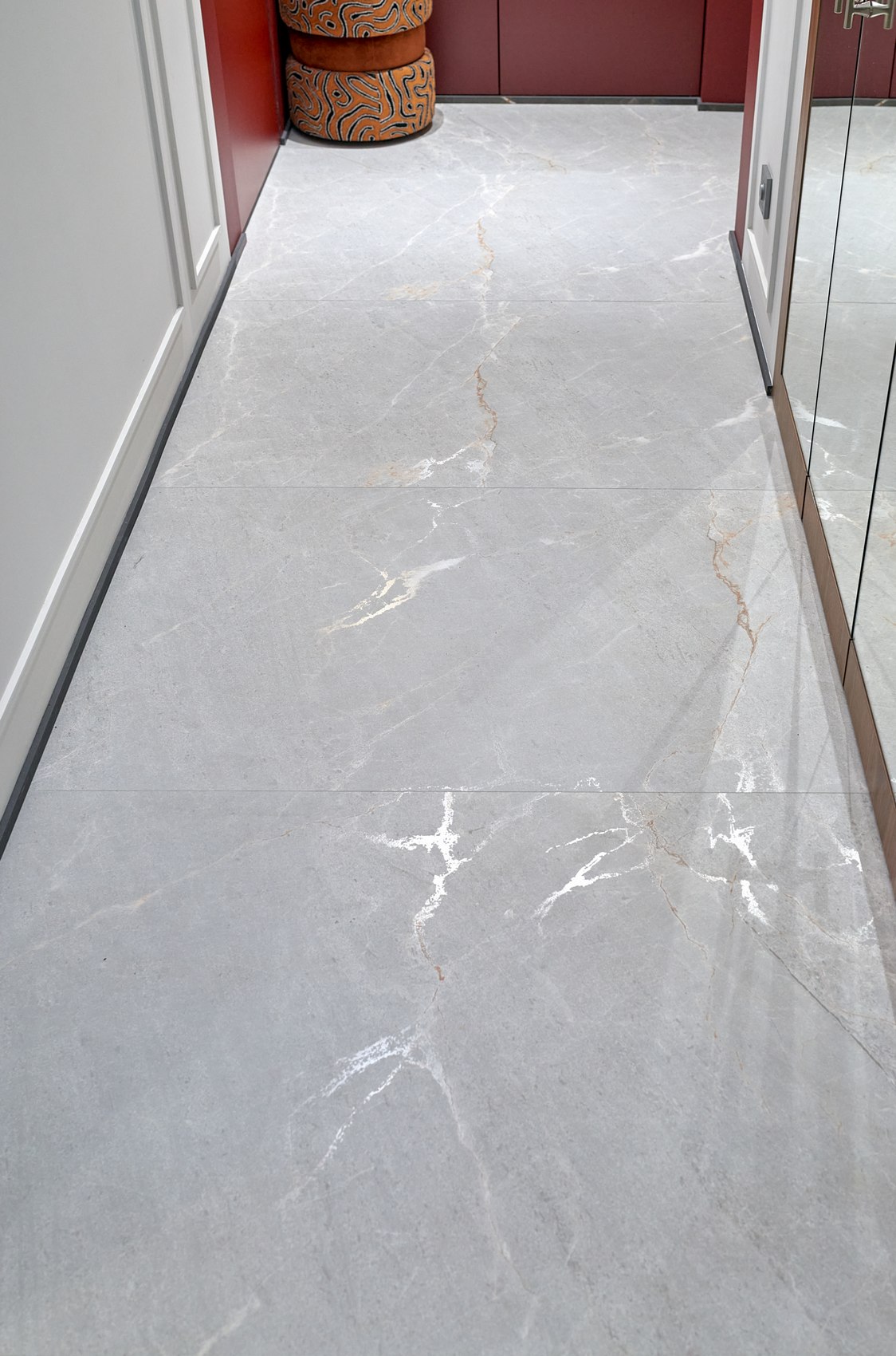 Полы в коридоре, гардеробной комнате и кухне выполнены из теплого серого керамогранита с эффектом карвинга. Материал нейтральный, но его переливы добавляют пространству блеск, некую игру поверхностей.