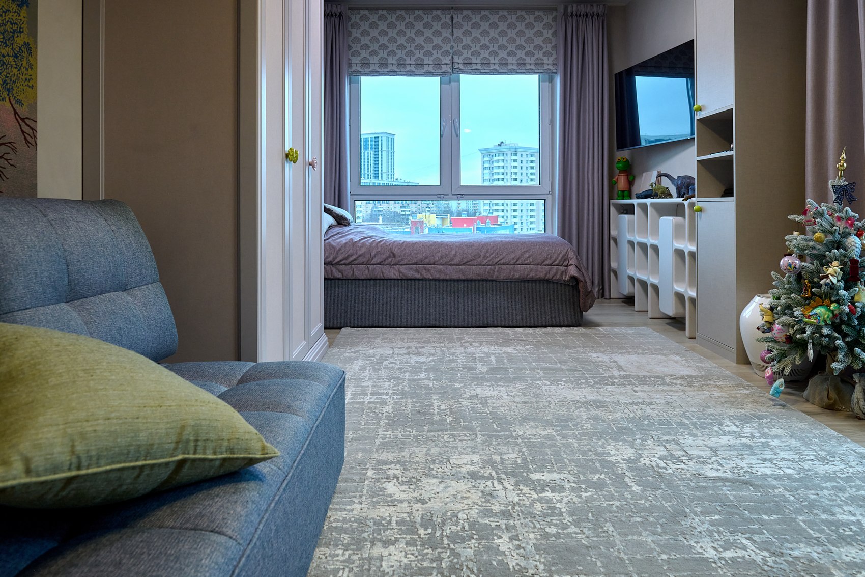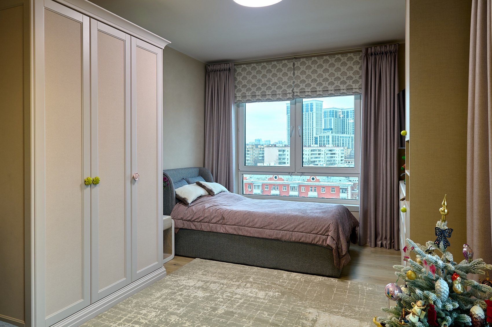 На шкаф в детской комнате поклеены обои выбранные в Мастердоме, там же приобретался весь текстиль на окна (полный комплекс работ - от замеров, выбора тканей, до пошива и навески). И также подобраны ткани и сшиты покрывала на кровати в детской и в основной спальне.